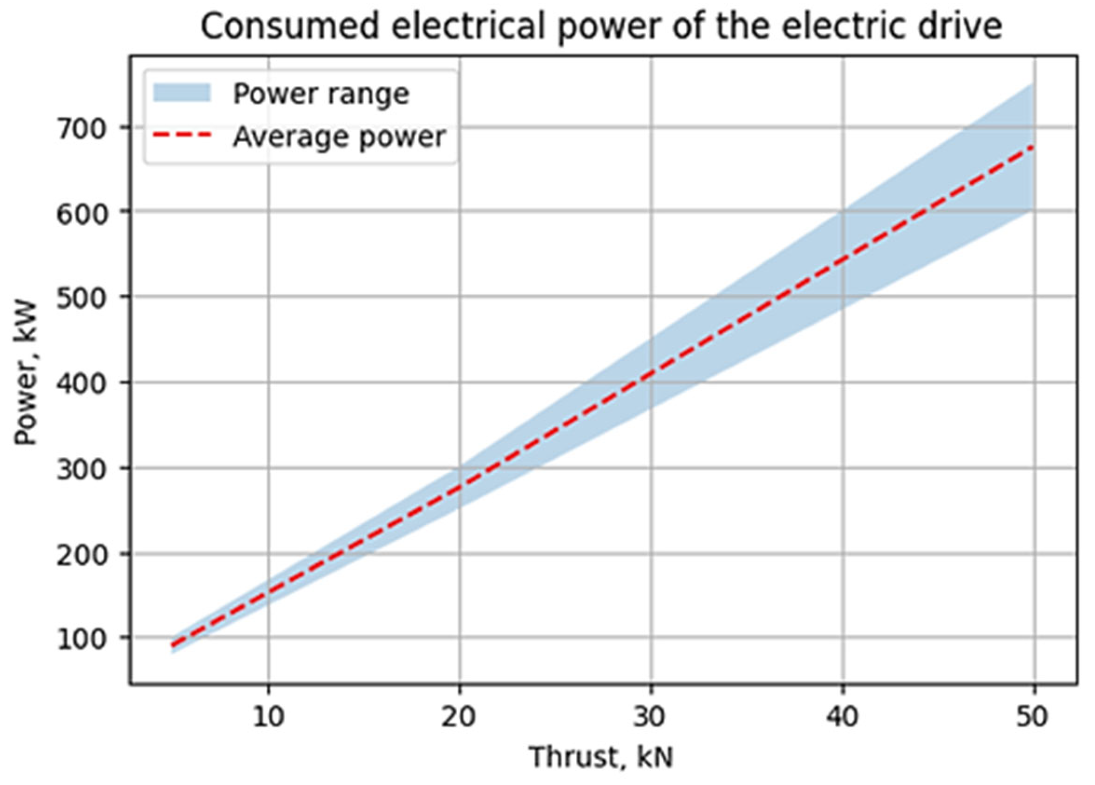 17], where for a motor with a thrust of about 30 kN, the power consumption was 400–500 kW.