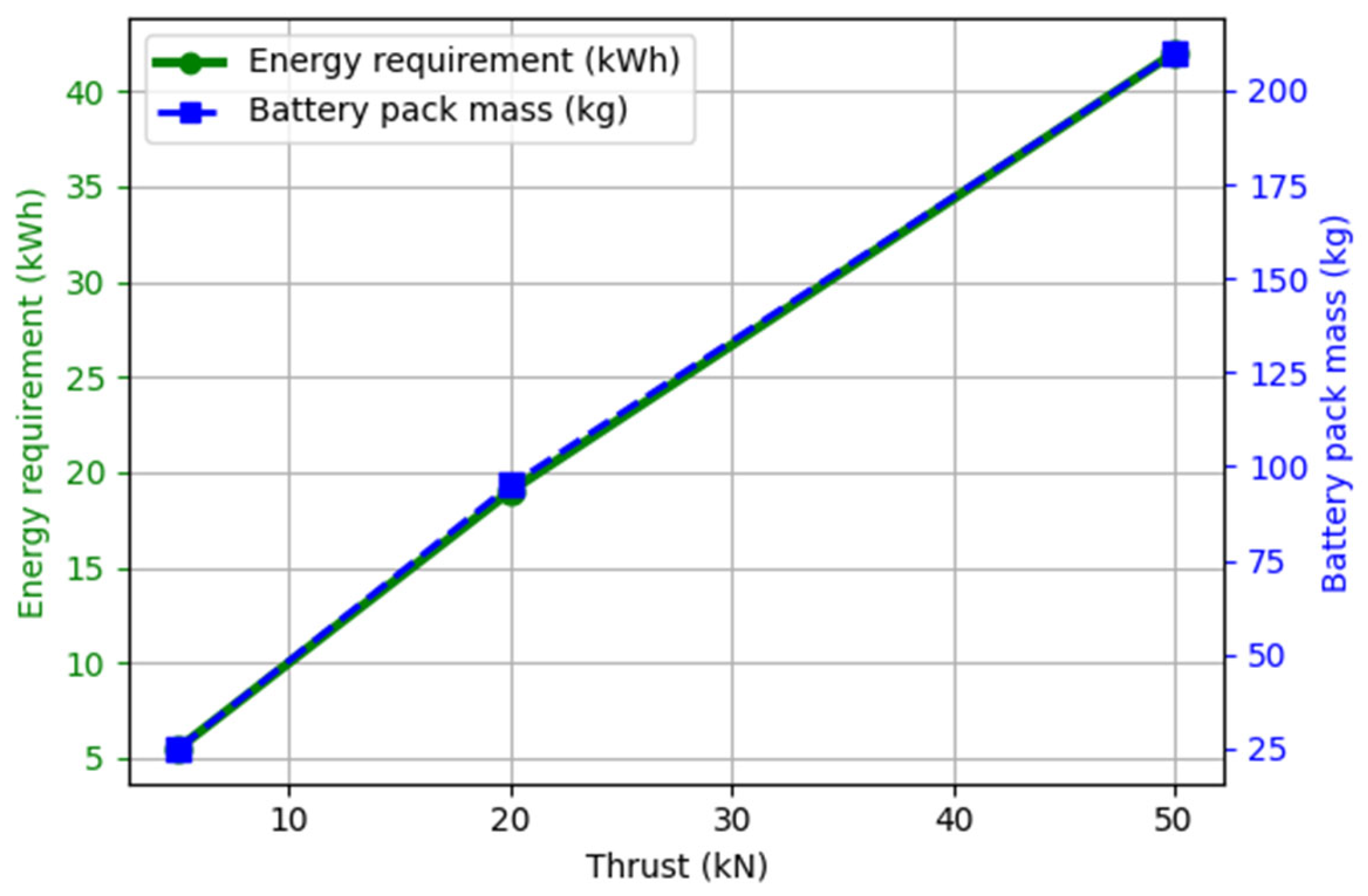 Figure 3. With an operating time of 200 s, the total energy consumption increases from 5.5 to 42 kWh for thrusts of 5–50 kN. Accordingly, the mass of the batteries at a specific energy of 200 Wh/kg is 25–210 kg. These estimates are comparable to [