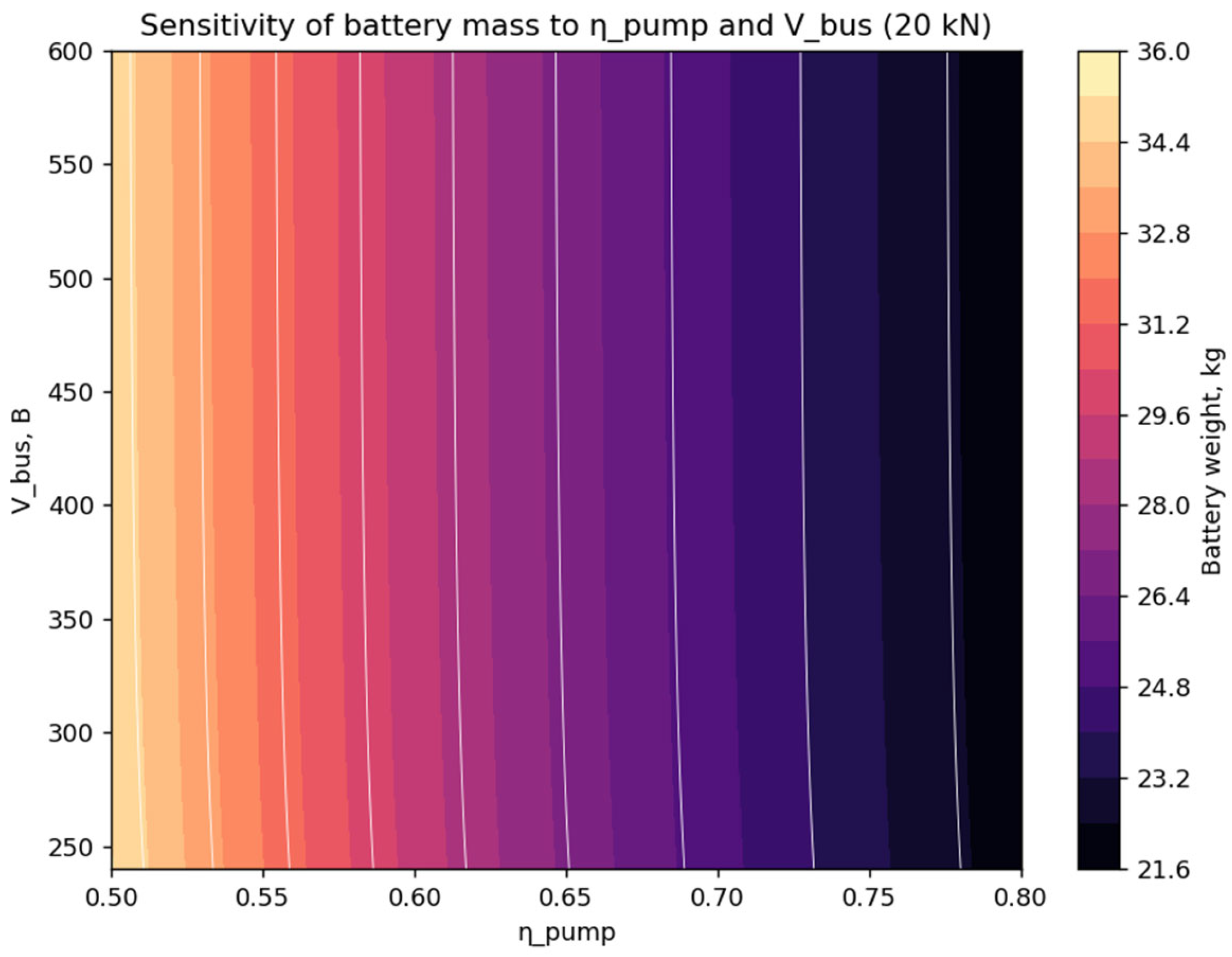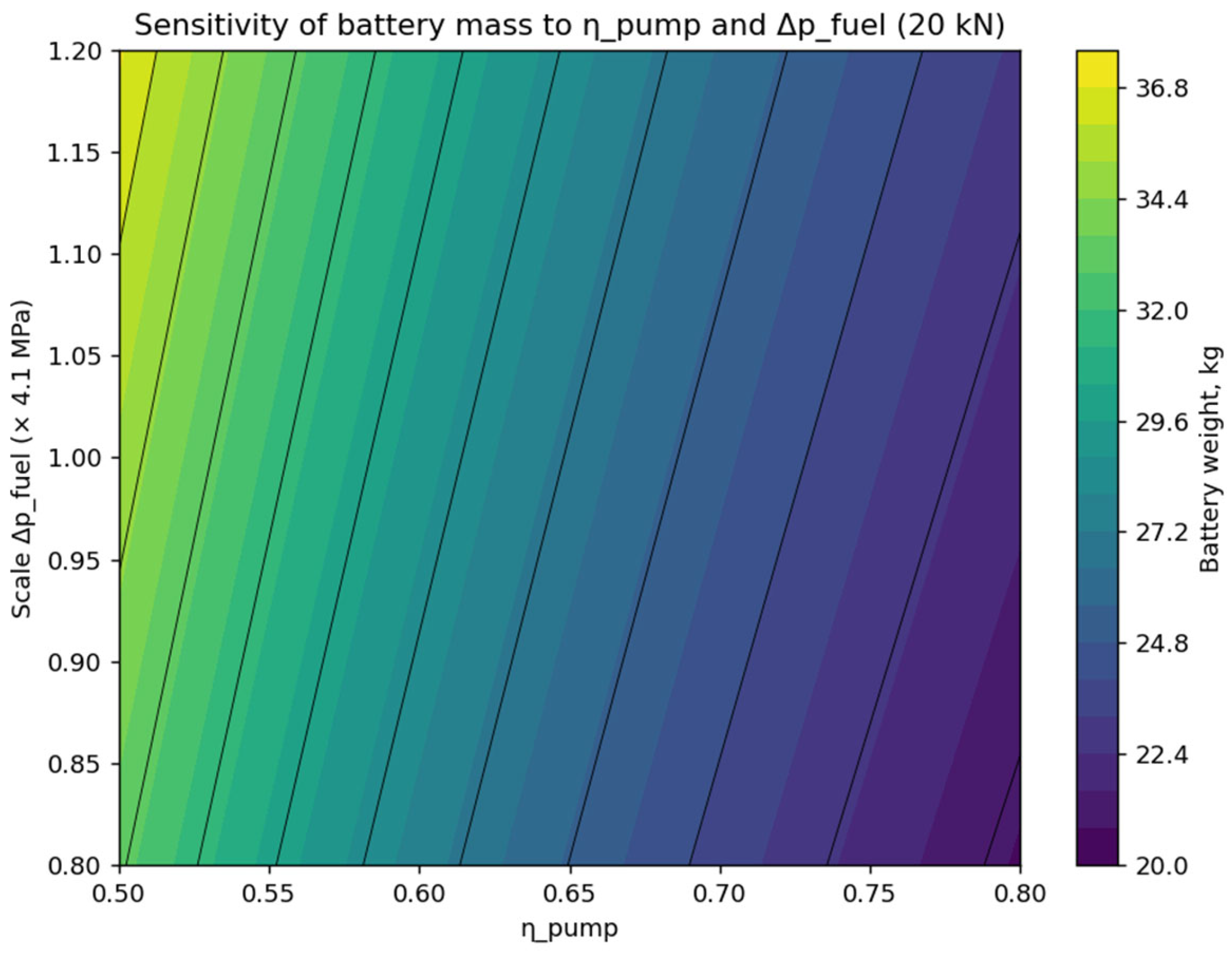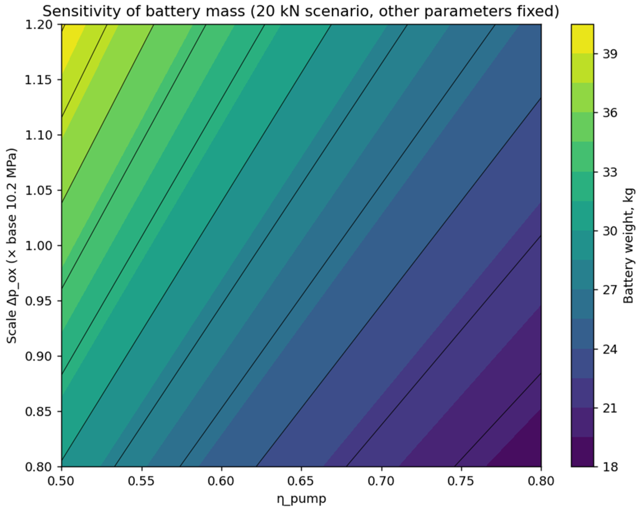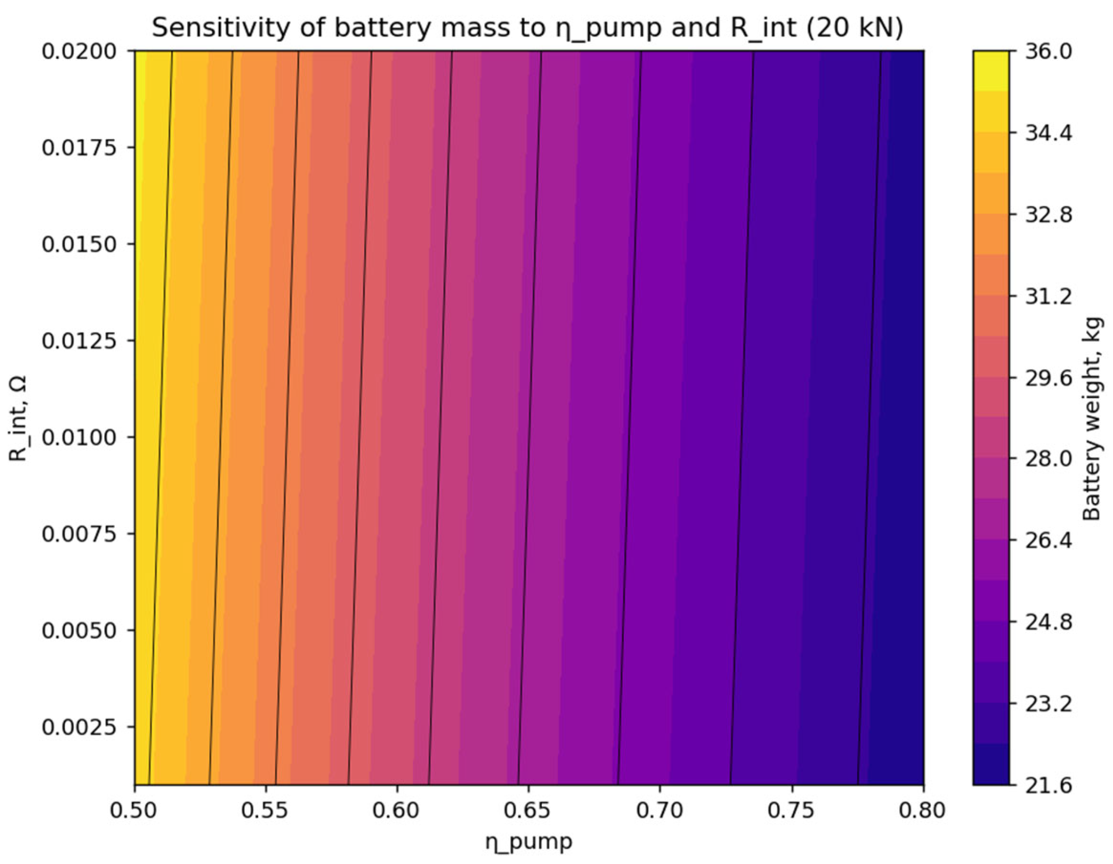 leads to a decrease in battery mass and a reduction in its variability. Analysis of the color scale shows that low pump efficiency (
