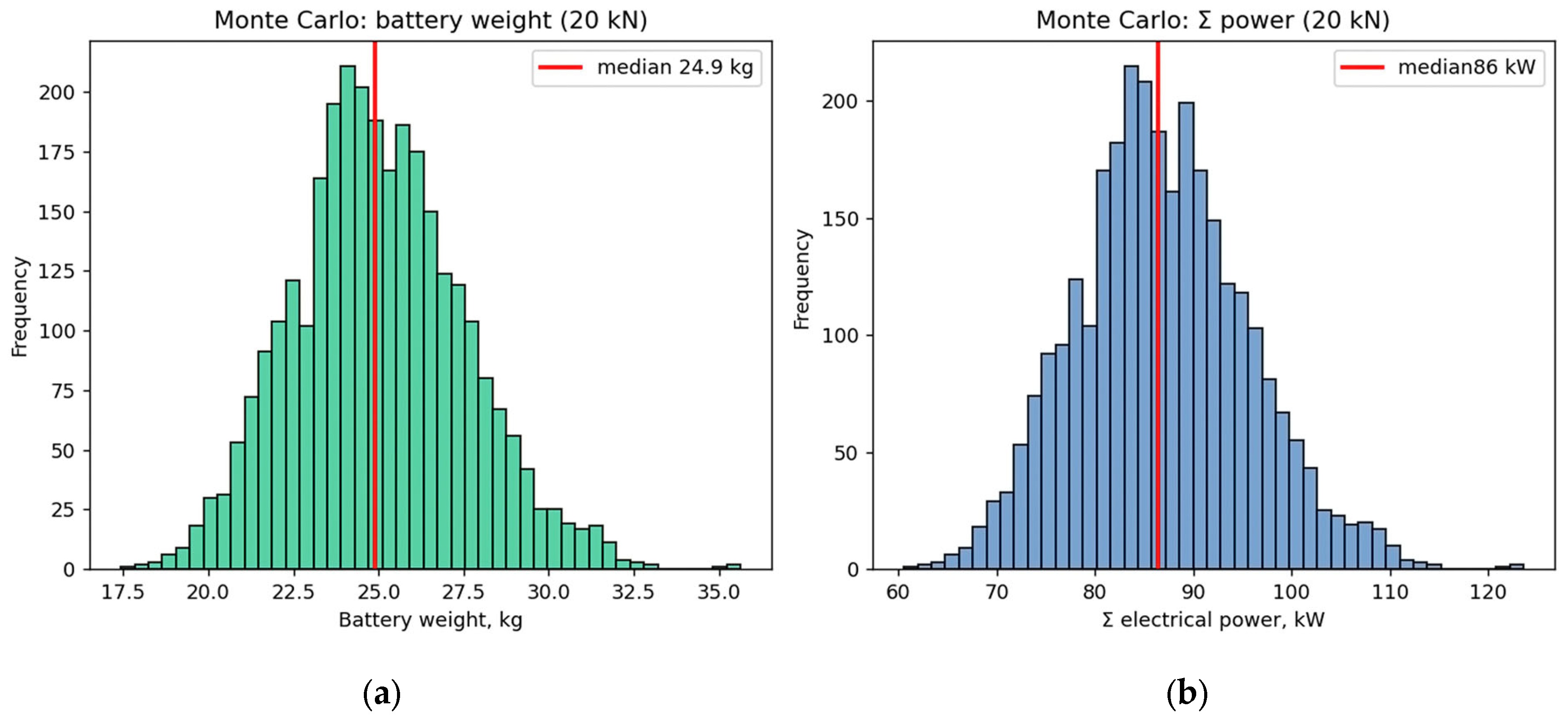 Figure 8 illustrates the distribution of battery pack mass and total power. The median mass was 24.9 kg with a range of 22.6–27.6 kg. The median power value is 86 kW, with a range of 78–96 kW. The spread of characteristics is mainly due to changes in pump efficiency and hydraulic losses.