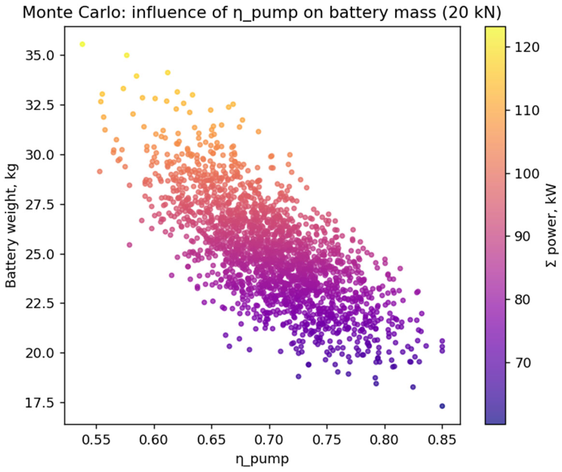 The key factors determining the characteristics of the battery pack are the hydraulic efficiency of the pumps and the pressure drop in the oxygen line. Their significance has been confirmed by both sensitivity analysis and correlation analysis results. Electrical parameters—bus voltage and internal battery resistance—have a secondary effect but become critical at power levels above 300 kW. Monte Carlo simulation confirmed the stability of the obtained estimates: at a thrust of 20 kN, the spread of the battery mass was only ±10%, which indicates the reliability of the model.