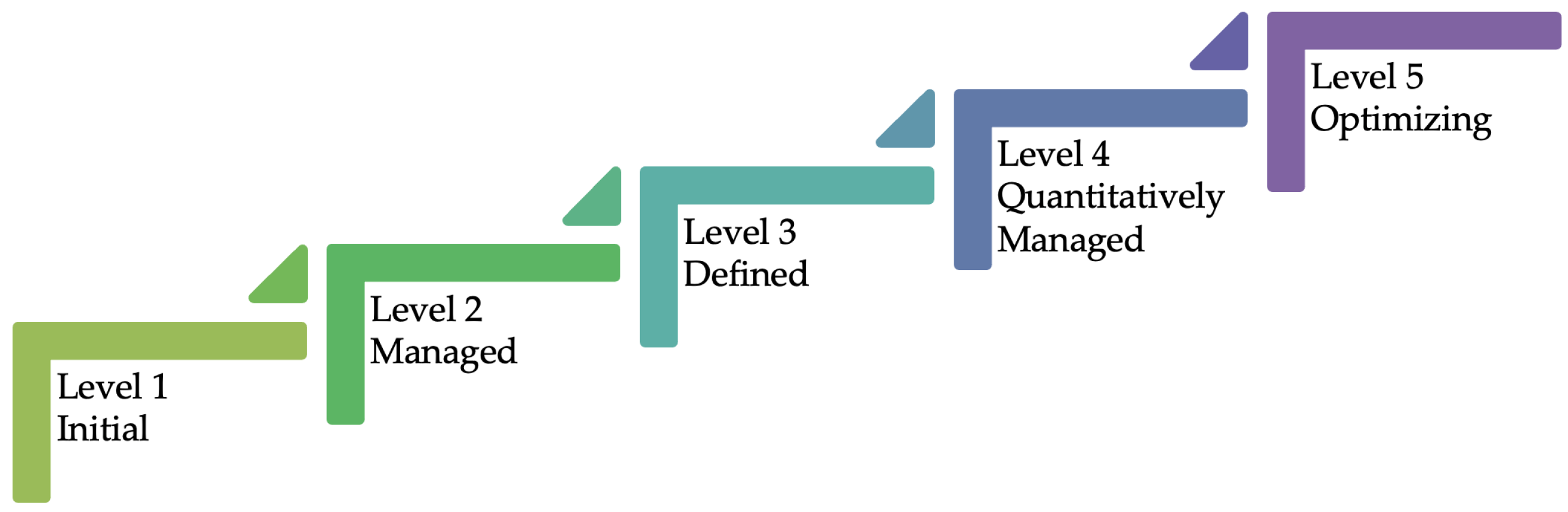 - CMMI Maturity Levels: Defines five levels (Initial, Managed, Defined, Quantitatively Managed, Optimized) for continuous process improvement, as shown in Figure 1. The focus is on tracking process maturity levels, from ad hoc and unpredictable processes (Level 1) to a state of continuous improvement (Level 5). Its structure is flexible, offering both staged (a predefined path) and continuous representations (allowing for organizations to focus on specific process areas). It is one of the most internationally recognized models, with applications in multiple industries and support from institutions such as ISACA and SEI [4].