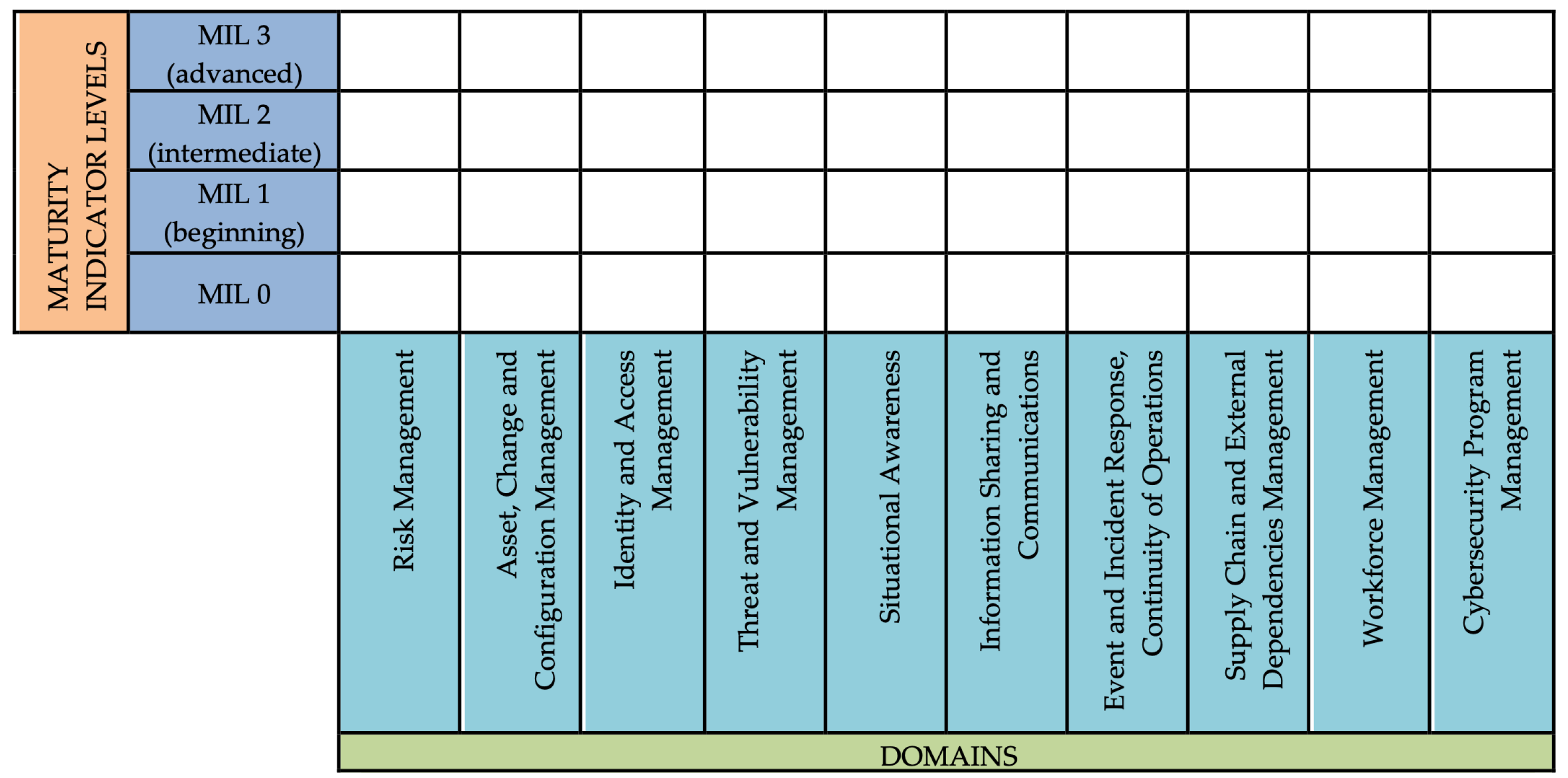 - C2M2 Maturity Levels: Defines four levels (MIL0-Incomplete, MIL1-Initial, MIL2-Managed, MIL3-Defined) that measure dual progression: focus and management. It includes more than 350 practices assigned to specific MILs in ten cybersecurity domains, as shown in Figure 2. It is primarily designed for self-assessment, which gives it moderate objectivity in a formal audit context [5].