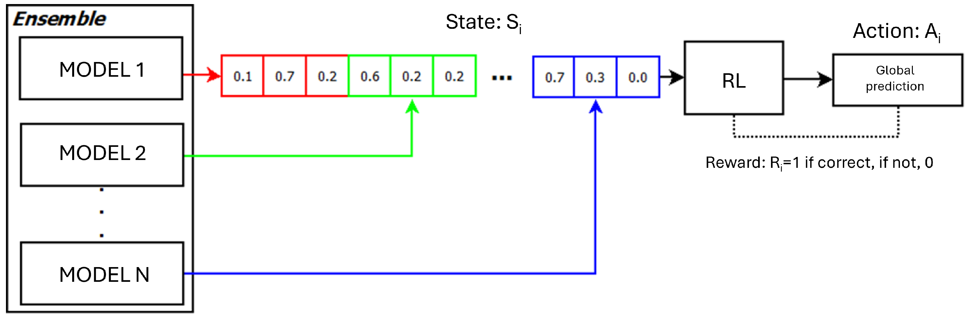 - States : Instances from the dataset. The RL model will receive the stacked predictions from each model in the ensemble as input. Therefore, for the RL model, each instance will be characterized by the probabilities of belonging to each class given by each model, instead of the original features. This is illustrated in Figure 1. The label of each instance will remain unchanged.