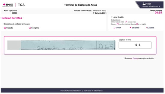 The PREP operation involves handwritten Actas de Escrutinio y Cómputo (AEC) forms completed by polling station officials, which are subsequently digitized at CATDs. The INE has developed a system that segments regions containing numerical voting results within these documents. This data is presented to data entry clerks at record entry terminals (Figure 2), with candidate or coalition identifiers hidden to prevent bias during manual transcription.