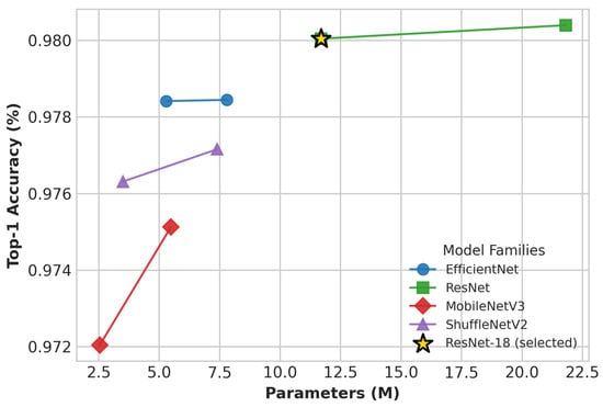 Figure 3 shows Top-1 accuracy (weighted average across all classes) versus parameter count for eight CNN architectures. The weighted metric was used because macro-average accuracy penalizes underrepresented or absent classes, skewing results in this highly imbalanced dataset. ResNet-34 achieved the highest accuracy (98.04%), while ResNet-18 closely follows with 98.00% accuracy, offering substantially better computational efficiency. Lightweight models such as MobileNetV3-Small and ShuffleNetV2 2.0 exhibited modest accuracy drops (97.20% and 97.72%), respectively.