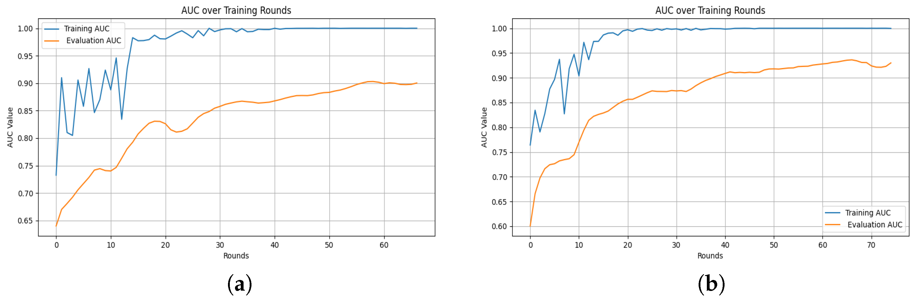 Figure 2. AUC performance curves for federated signature verification: (a) training with three clients; (b) training with five clients.