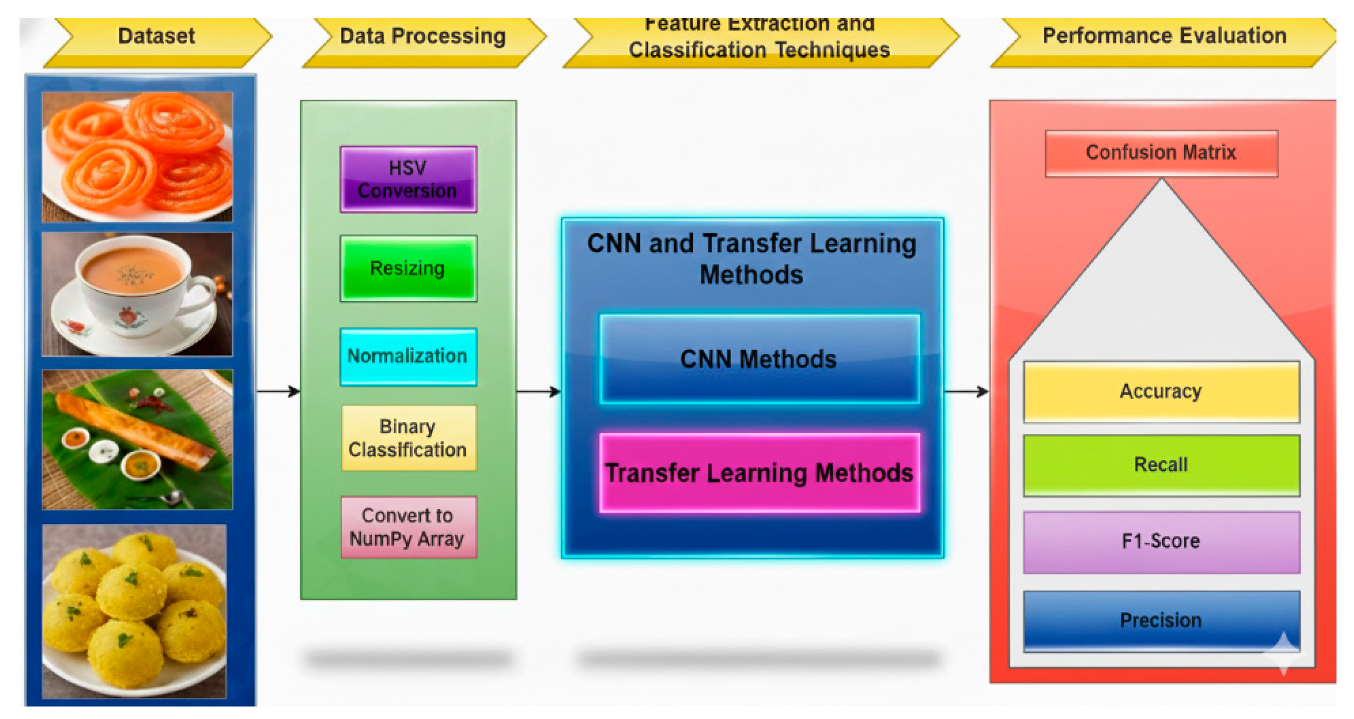 In the present research, the CNN and transfer learning with DenseNet, Inception, MobileNet, VGG16, and Xception is used. Our Indian food classification system is shown in