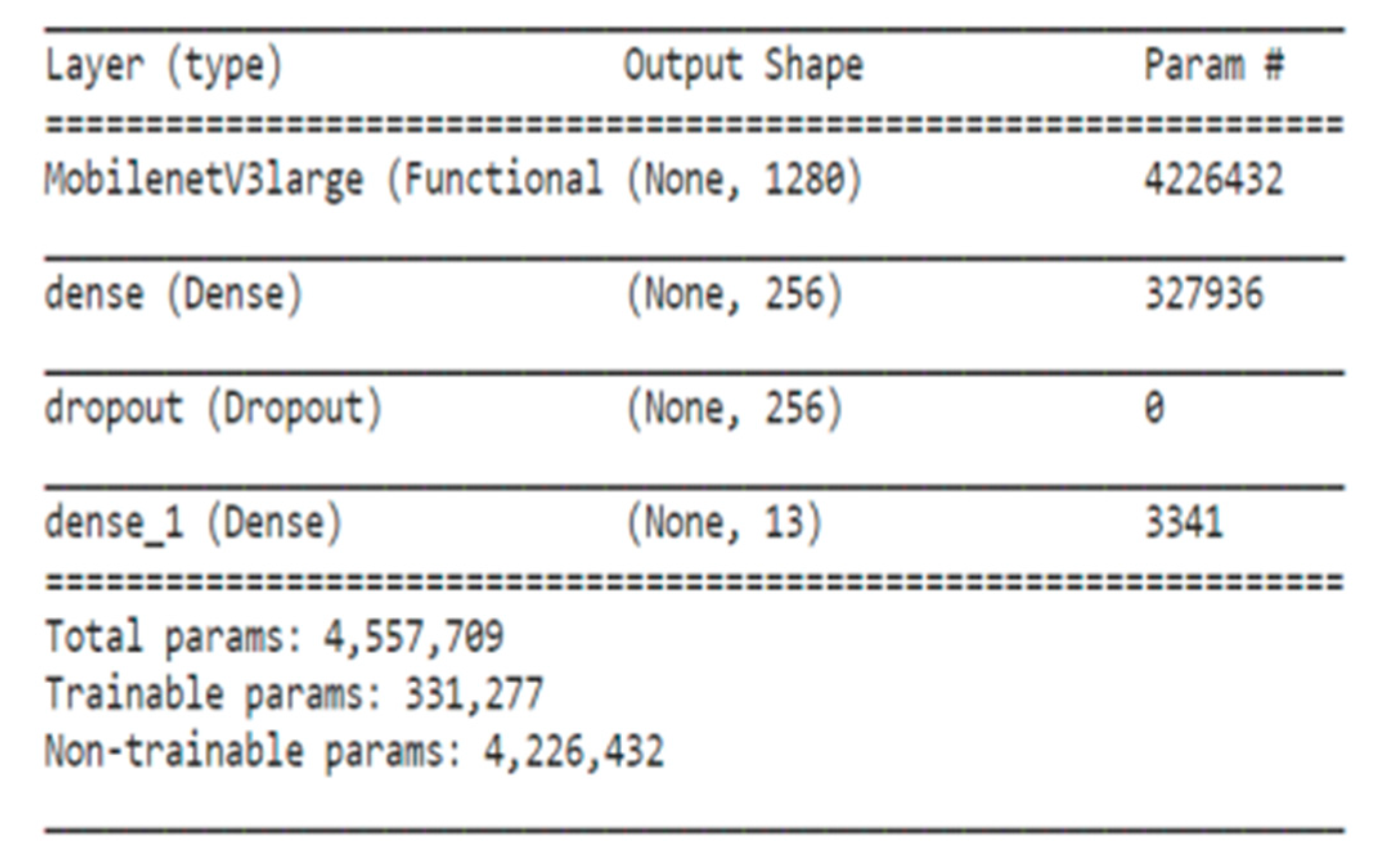 13] was employed for transfer learning using ImageNet pre-trained weights to enhance food classification performance. The model was used for feature extraction, followed by a dense layer with 1280 units and ReLU activation. Final classification was performed using a dense layer with units equal to the number of food categories (13). The model summary is presented in