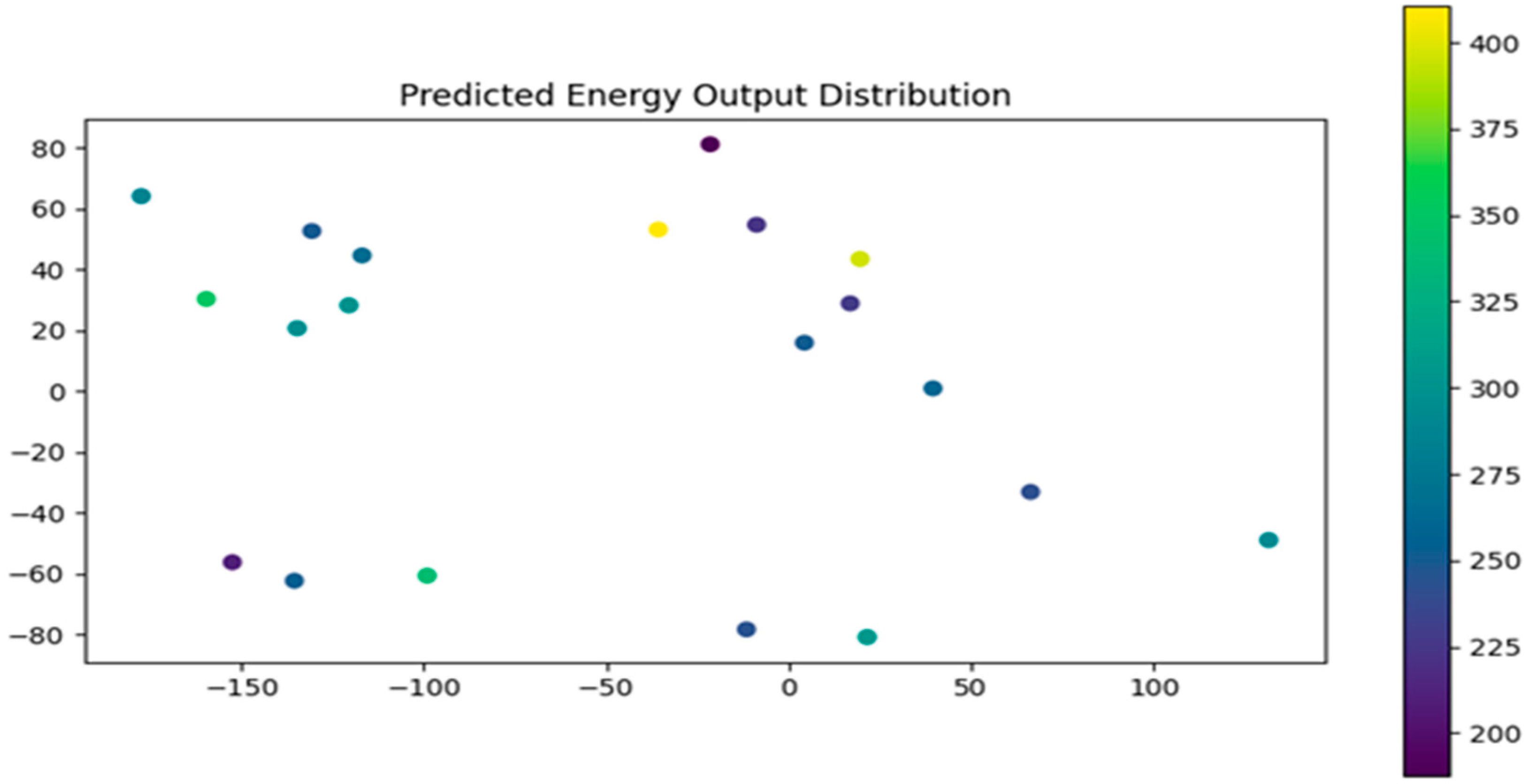 While explicit grid-flow equations, economic dispatch models, or network constraints were not implemented, the proposed framework enables preliminary grid planning support by identifying spatially optimal regions that can reduce transmission distances and improve regional energy availability. Model outputs were qualitatively validated through spatial consistency checks, where regions with similar geographical and environmental characteristics exhibited comparable predicted energy potential. The input value ranges were selected to represent realistic environmental and geographical conditions commonly reported in renewable energy studies and publicly available benchmark datasets. These bounds ensure physical plausibility while providing sufficient variability to capture nonlinear relationships during model training and evaluation. Energy predictions were visualized across geographical coordinates using gradient-based color mapping, enabling clear identification of regions with varying energy potential. Distinct spatial clusters corresponding to high and low energy outputs were observed. Furthermore, regions with similar geographical characteristics exhibited comparable energy potential, with clear latitude-dependent trends—lower latitudes generally showing higher predicted values. Additional localized variations influenced by altitude and environmental conditions were also effectively captured. By explicitly embedding GIS-derived spatial features into the deep learning workflow and evaluating their impact through spatial clustering and visualization, this experiment demonstrates a clear methodological advancement over conventional GIS+ML approaches and provides actionable insights that directly support SDG 7 (affordable and clean energy), SDG 9 (resilient infrastructure), and SDG 13 (climate action).