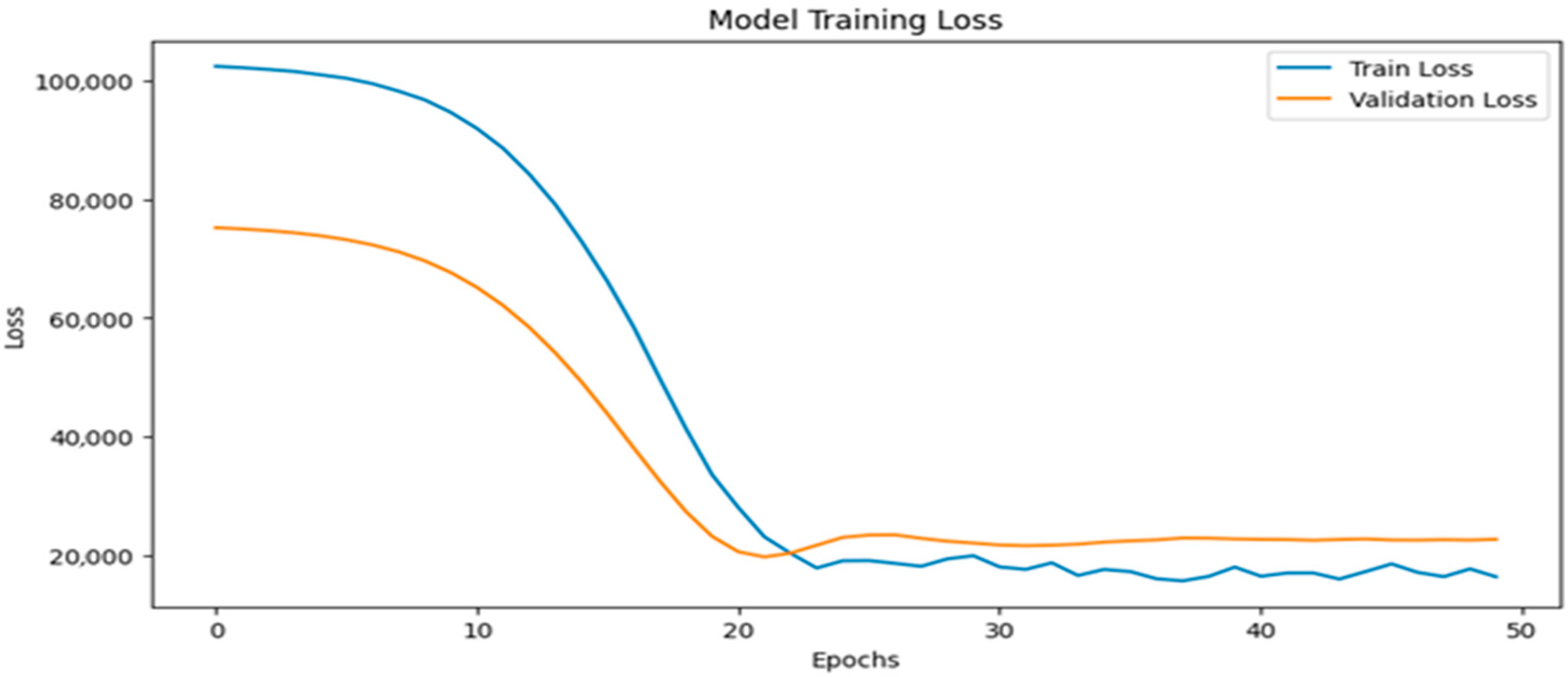 The model was trained using Mean Squared Error (MSE) as the loss function, which is well-suited for regression problems and penalizes large prediction errors. Optimization was performed using the Adam optimizer with an initial learning rate of 0.001, leveraging adaptive learning rates and momentum-based updates to ensure efficient convergence. Training was conducted with a batch size of 16 over 50 epochs, and a validation split was used to monitor generalization performance. To further prevent overfitting, early stopping was employed by tracking validation loss with a patience of 10 epochs, halting training when no further improvement was observed.