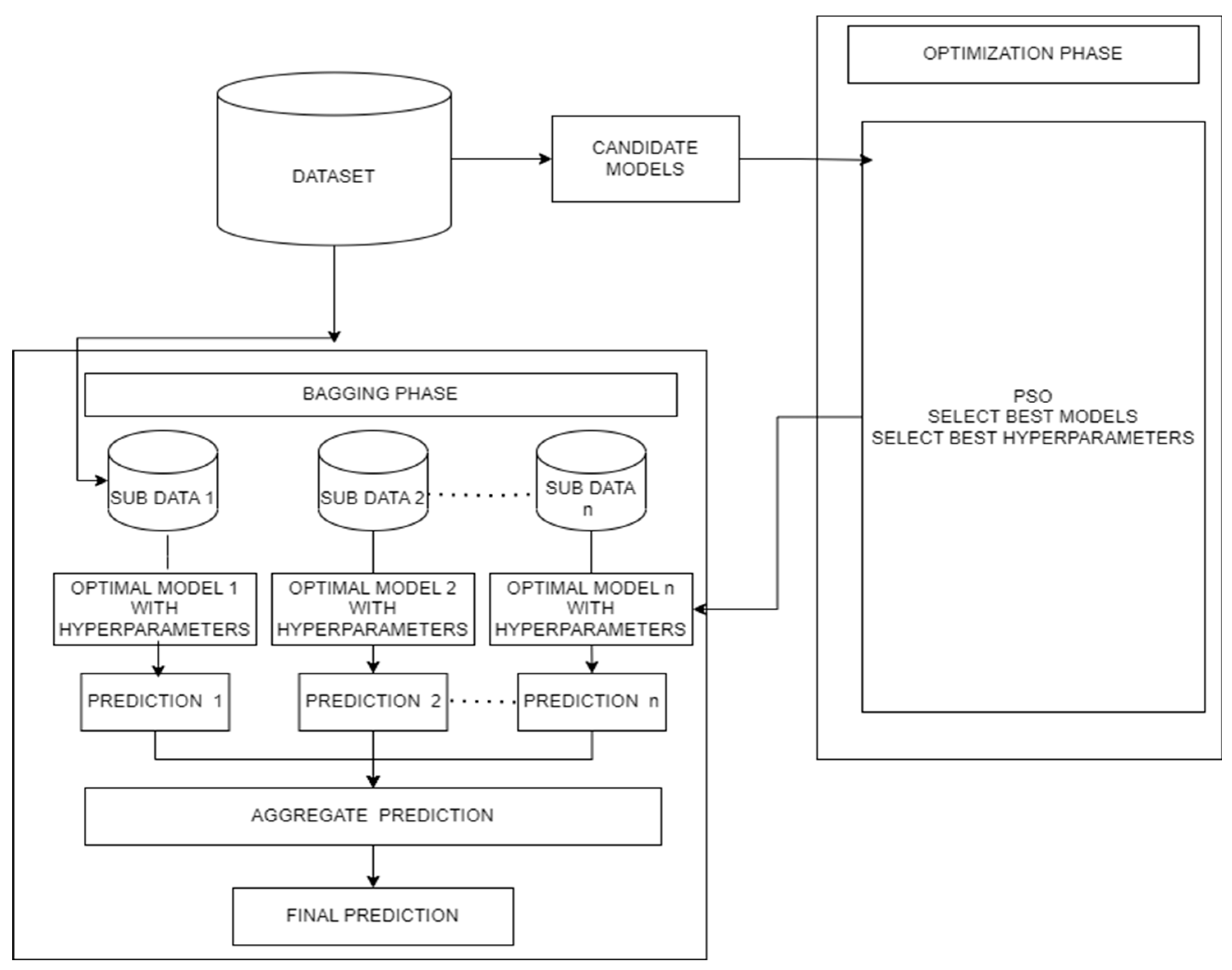 Particle Swarm Optimization is applied to explore the hyperparameter space of each candidate model and evaluate their performance on the validation set. Based on fitness values (e.g., RMSE minimization), PSO identifies the top-performing models, which are selected as base learners for the stacking ensemble.