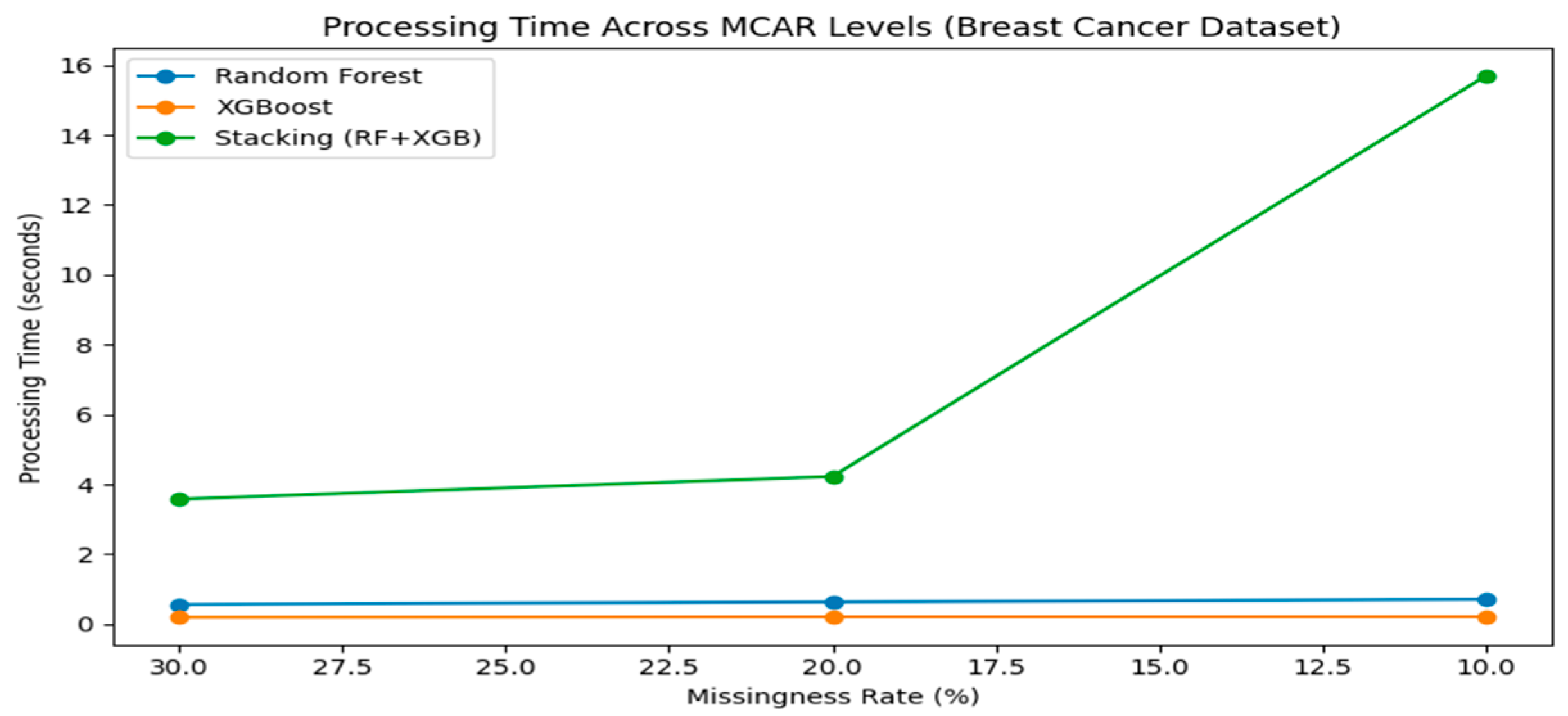 However, the methodology has some limitations. The computational cost of the PSO-optimized stacking model is significantly higher than individual learners. For example, the processing time increases from less than 1 s for Random Forest to 4.22 s at 20% MCAR and 15.70 s at 10% MCAR on the breast cancer dataset. While this cost is acceptable for offline imputation in research or clinical datasets, it may become a bottleneck for very large-scale or real-time datasets. Moreover, the approach relies on properly tuning PSO parameters; poor initialization could lead to suboptimal selection of base learners, slightly reducing imputation accuracy.