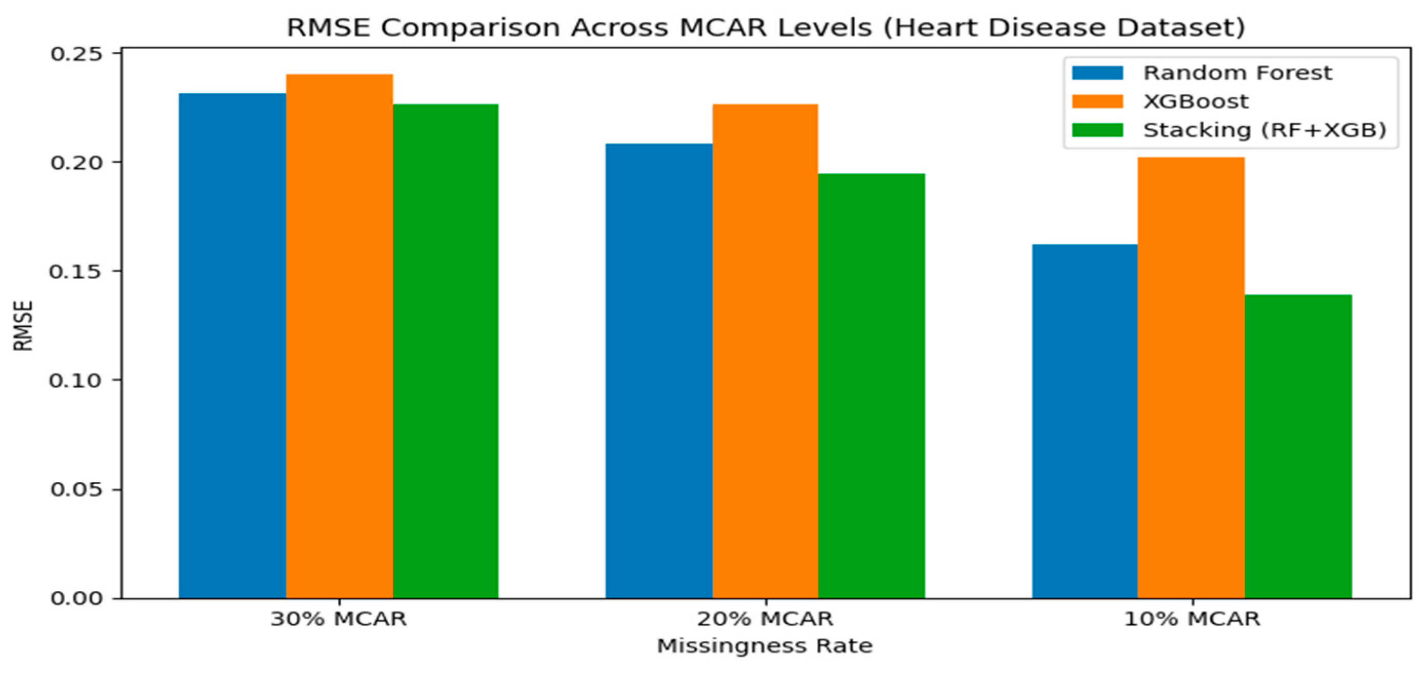 7]. A comprehensive comparison of imputation techniques in healthcare diagnostics was conducted and reported that RF-based approaches consistently yielded lower errors across missingness levels ranging from 10% to 25% [
