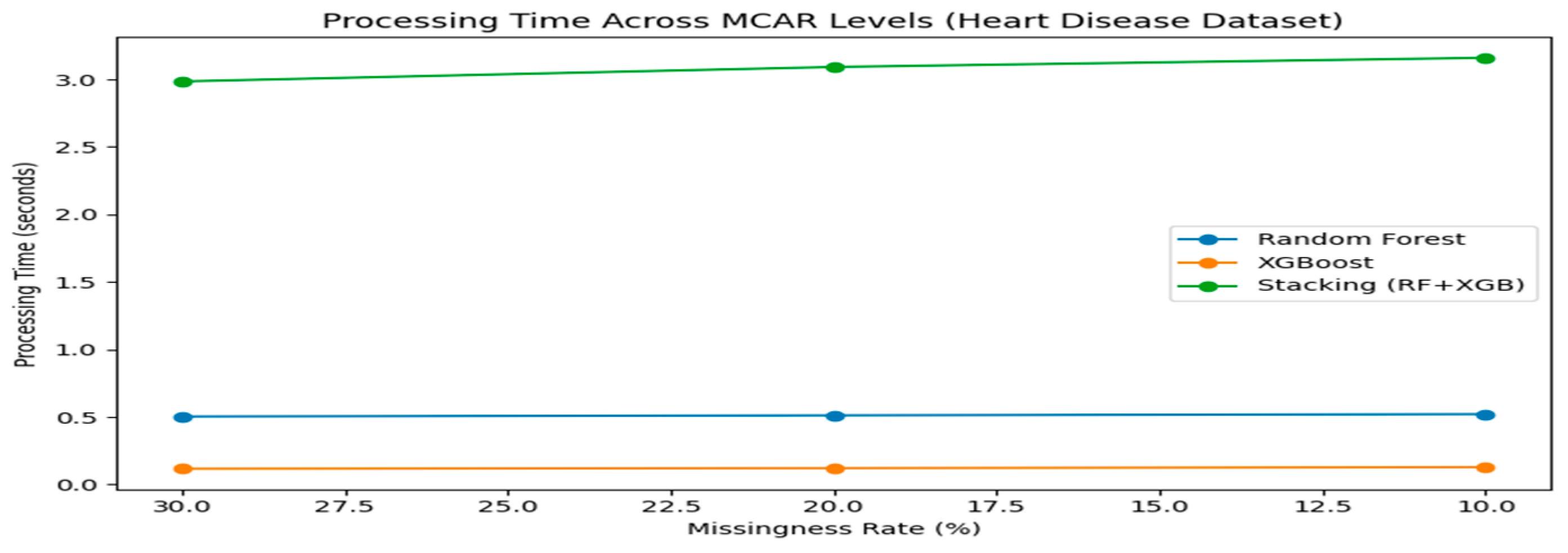One notable advantage of the proposed methodology is its robustness across datasets with varying characteristics. While the breast cancer dataset shows high R2 values for the stacking model (up to 86.56%), the heart disease dataset exhibits lower R2 values (75.19% at 10% MCAR), reflecting its more complex or less linear feature relationships. Despite this, the hybrid model consistently outperforms single learners, confirming its generalizability across healthcare domains. Additionally, the ensemble approach demonstrates resilience to different levels of missingness, effectively handling both moderate (20–30%) and low (10%) missing data without substantial degradation in performance.