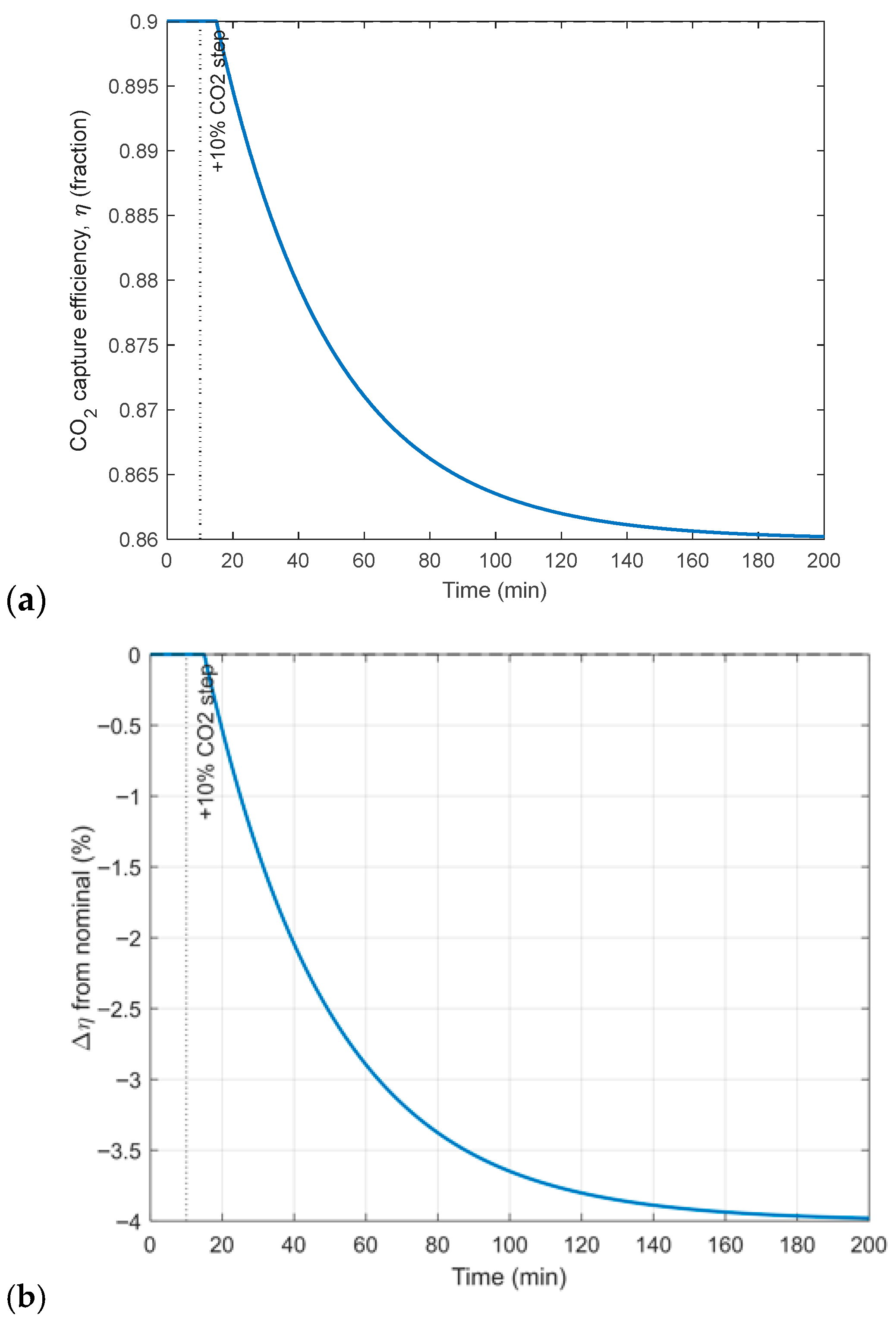 The open-loop responses revealed strong nonlinearities and multi-time-scale dynamics. Changes in inlet CO2 concentration resulted in rapid variations in capture efficiency, whereas flue gas flow rate disturbances exhibited slower dynamics dominated by solvent circulation and regeneration processes. These observations confirm the necessity of advanced control strategies capable of handling both fast disturbances and slow solvent dynamics.