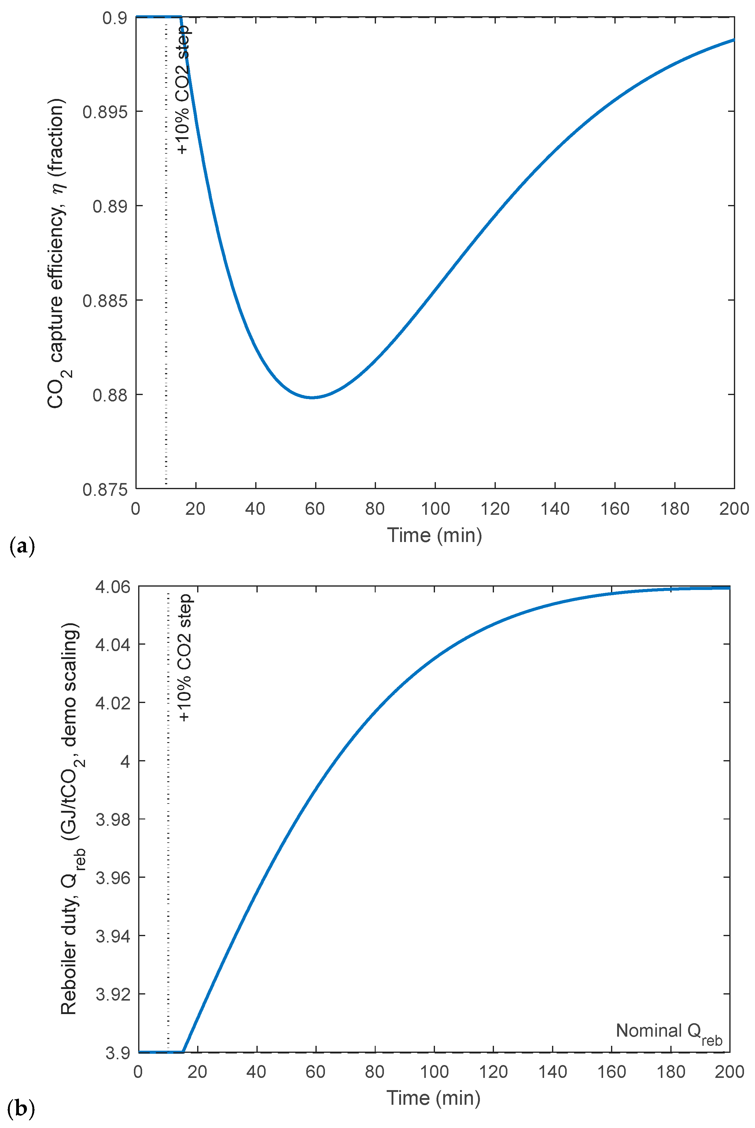 The PID controller parameters were tuned using a step-response-based procedure. An open-loop step change in the reboiler heat duty was first applied to identify the dominant dynamic characteristics of the capture efficiency response. Initial controller gains were then estimated based on the observed process dynamics and subsequently refined through iterative closed-loop simulations to ensure stable operation, limited overshoot, and acceptable settling time under representative disturbance scenarios. Anti-windup protection was incorporated to prevent controller saturation under large disturbances. The final PID parameters were kept constant for all simulations, reflecting the level of control complexity commonly encountered in industrial post-combustion CO2 capture applications.
