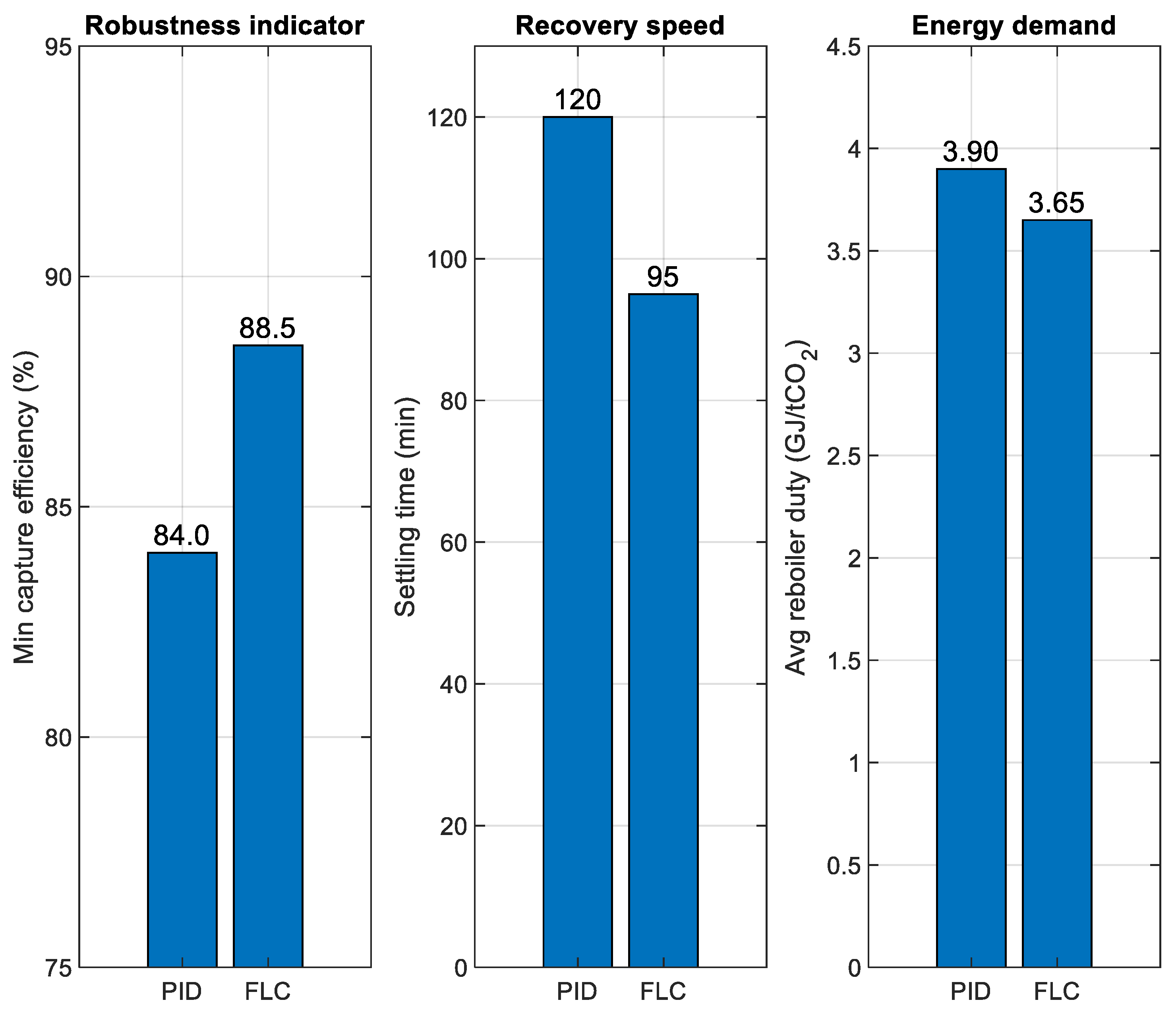 Control performance was assessed using quantitative metrics relevant to industrial operation, including minimum and average CO2 capture efficiency, reboiler energy duty normalized per ton of captured CO2, settling time, and robustness to disturbances.