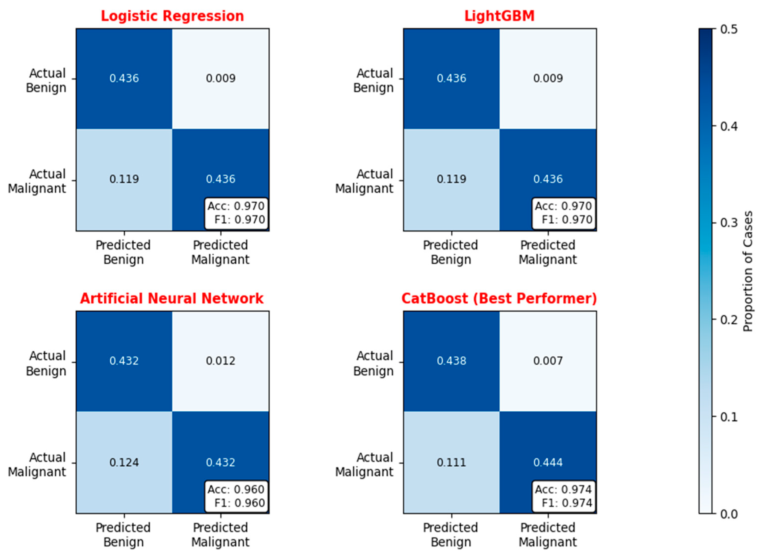 - Darwich, M.; Bayoumi, M. An evaluation of the effectiveness of machine learning prediction models in assessing breast cancer risk. Inform. Med. Unlocked 2024, 49, 101550. [Google Scholar] [CrossRef]