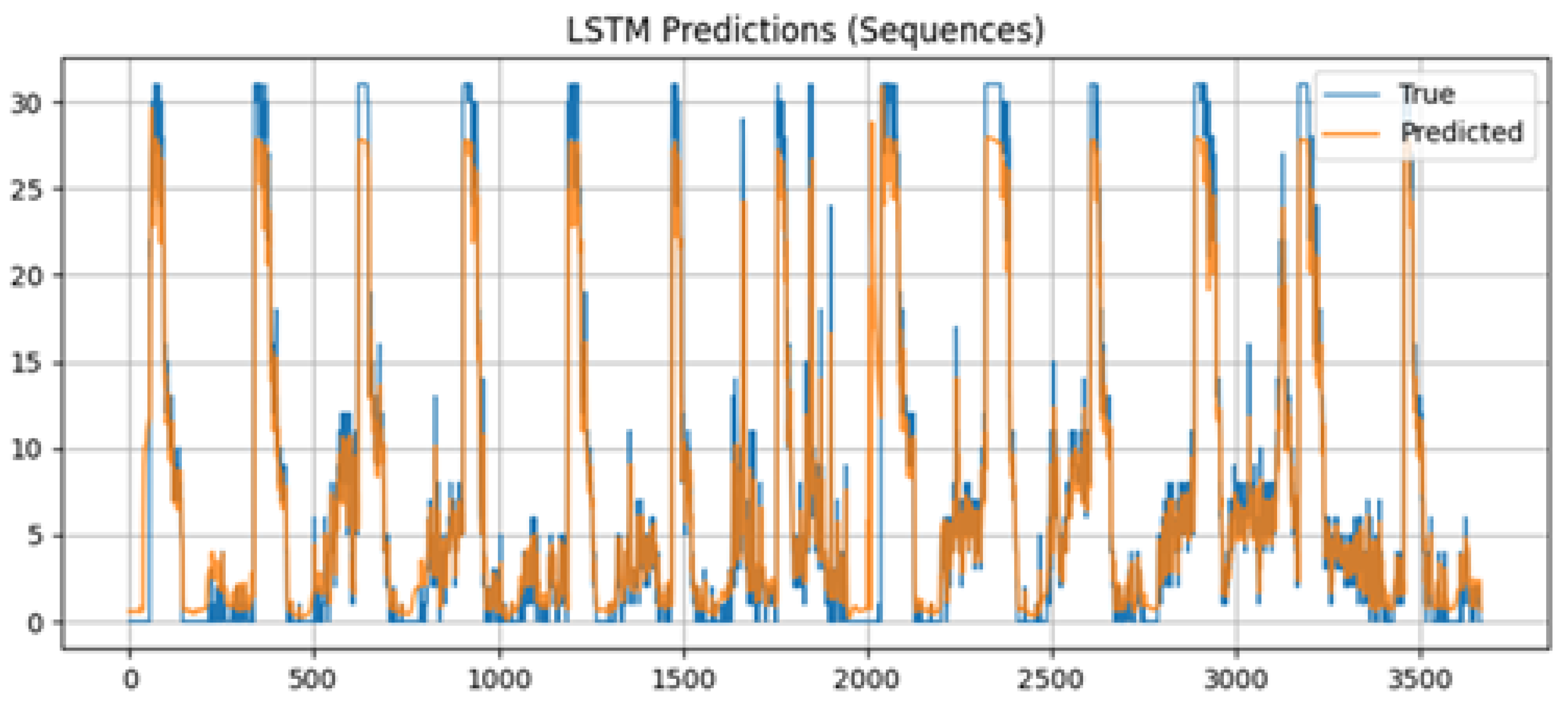 The classic LSTM shows a moderate accuracy (RMSE = 2.8844), similar to the tree-based models, but with a significantly longer training time (235.83 s). This demonstrates that, without additional structures such as convolutions or hybrid approaches, the LSTM does not fully utilize its computational potential to achieve significantly better results. Nevertheless, it captures longer-term patterns better than tree-based models, as the corresponding prediction curves illustrate.