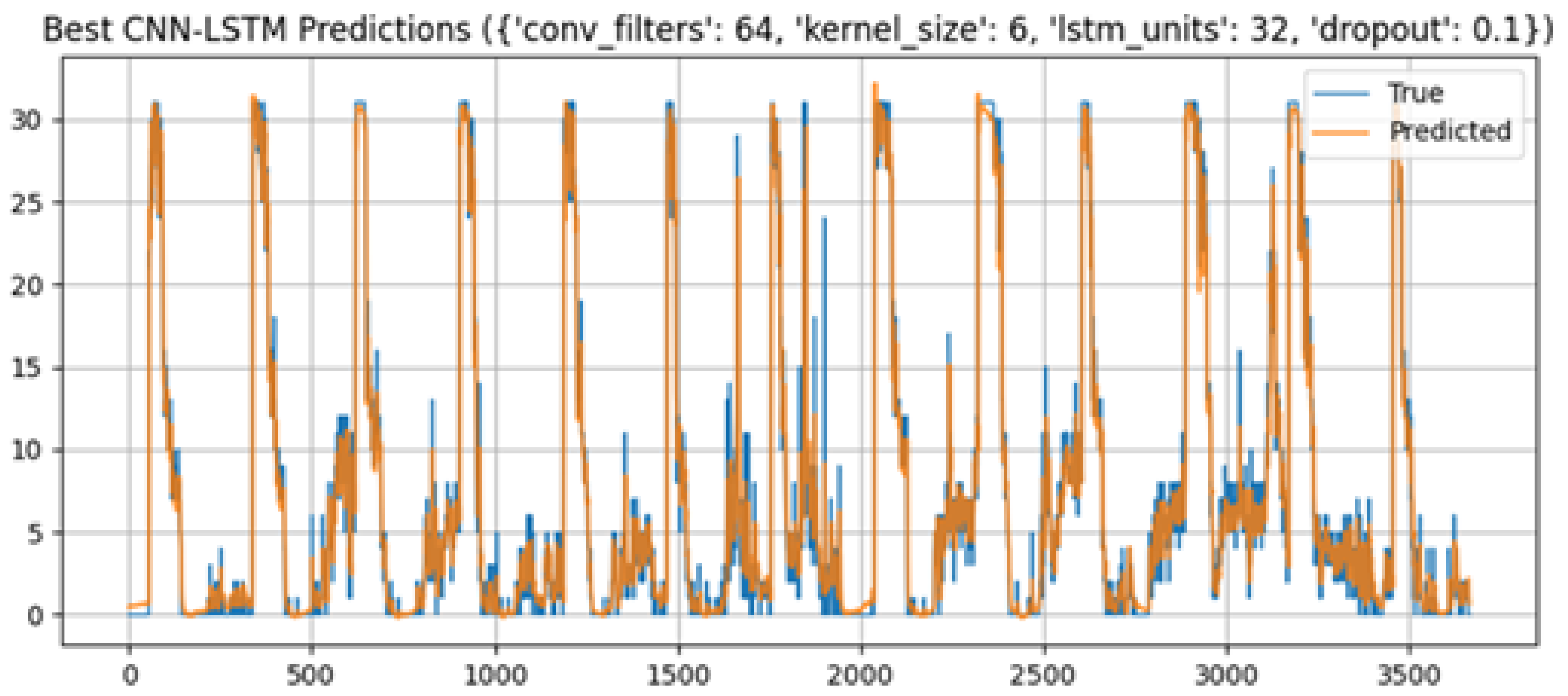 In contrast, explicit hyperparameter tuning was applied to the CNN–LSTM model due to its increased architectural complexity and sensitivity to configuration choices. A grid search was conducted over key parameters, including the number of convolutional filters, kernel size, number of LSTM units, and dropout rate, with the final configuration selected based on validation performance.
