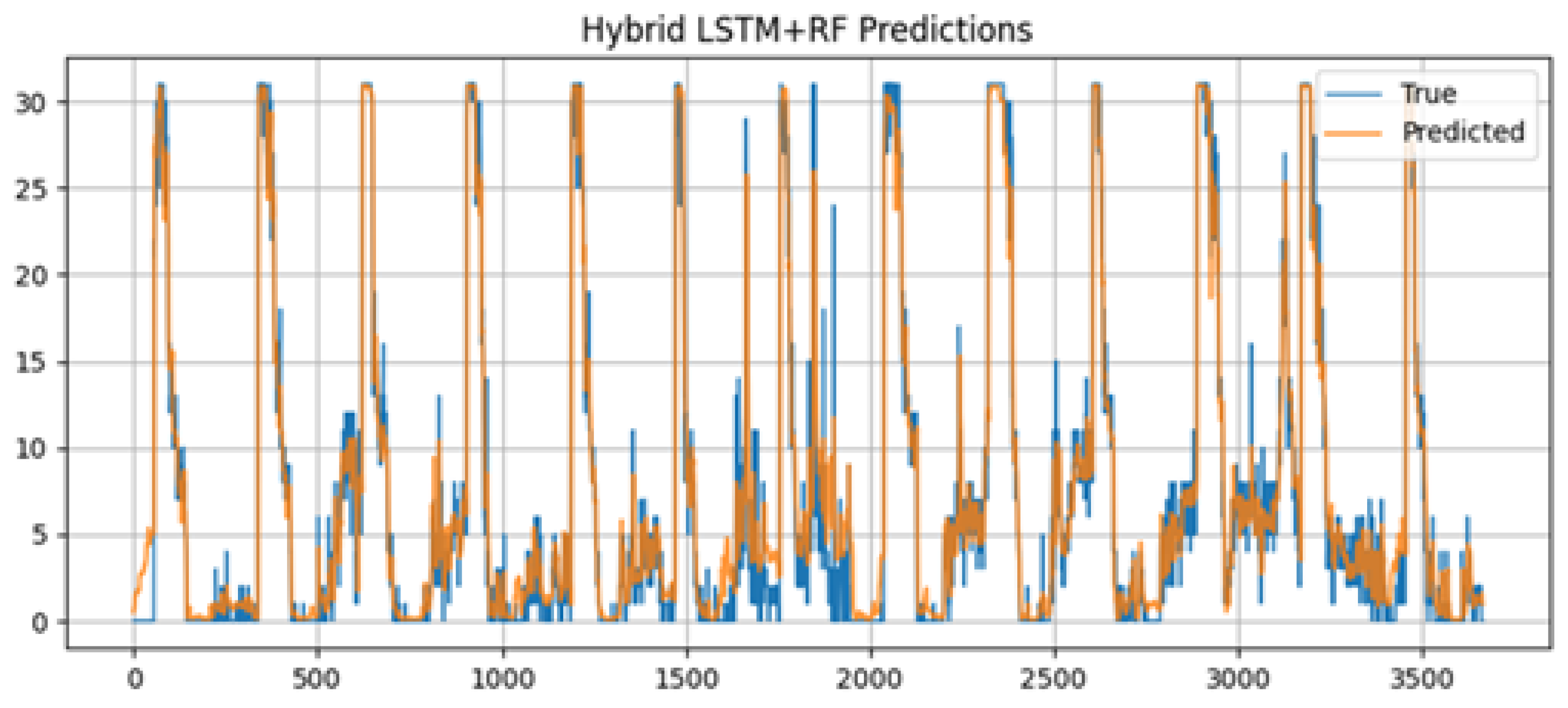 The hybrid LSTM Random Forest model offers the best compromise between accuracy and computational effort. It exhibits significantly higher accuracy than pure tree-based models (RMSE = 2.5872) and a significantly lower error rate than simple LSTM models, while its training time (161.21 s) is considerably shorter than that of pure deep learning models. This makes it suitable for semi-real-world applications where a balance between speed and efficiency is required.
