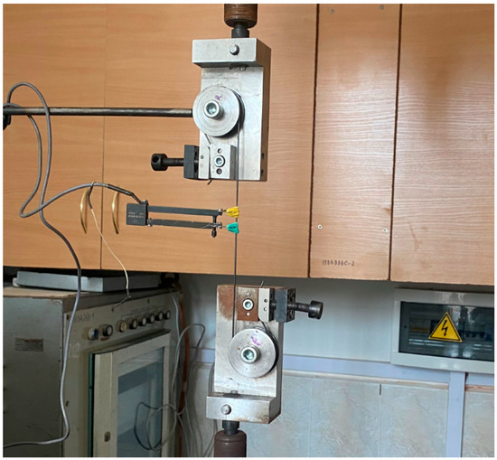 The experiments were conducted at room temperature using an STM-100 servo-hydraulic testing machine. Uniaxial tensile tests were performed under sinusoidal cyclic loading with stress control. The tests were carried out at several loading frequencies with a constant stress ratio of Rσ = 0.1 in all cases. During the tests, the applied load and displacement were recorded using an inductive displacement sensor (Bi-02-313), while the longitudinal strain was measured with an extensometer (Bi-06-308). Stress and strain values were calculated from the data acquired through the Test Builder software version 5.3. The general view of the specimen mounted in the grips of the testing machine is shown in Figure 1.