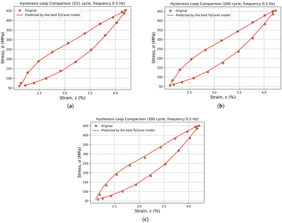 This study confirms the effectiveness of the AutoML (PyCaret) approach for developing regression models to predict the hysteresis behavior of shape memory alloys. The best results were achieved by the LightGBM model for the 0.3 Hz and 1 Hz frequency and the CatBoost model for 0.5 Hz and 5 Hz, as confirmed by high R2 values and low RMSE, MSE, and MAPE across both the test dataset (cycles 100–250) and independent cycles (251, 260, and 300). The models accurately reproduced complete σ–ε hysteresis loops, showing strong agreement with experimental data.