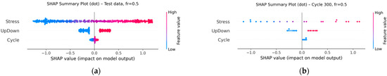 SHAP summary plots for the test dataset (a) and for cycle 300 (b) at a loading frequency of 0.5 Hz.
