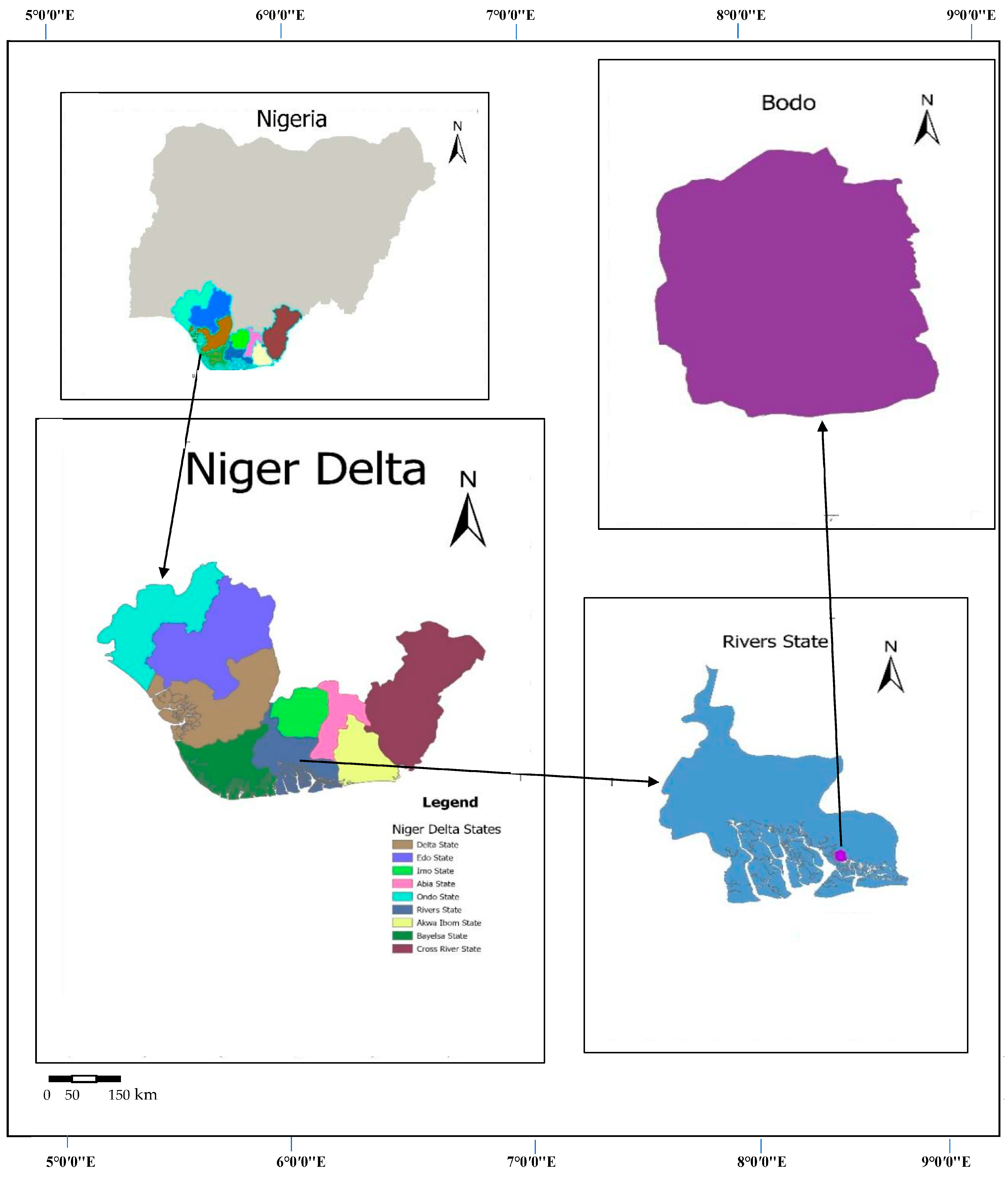 - Nkeeh, D.K.; Korfii, U.; Ugadah, U.; Vaah, B.D. Prospects of oil spill remediation in the Niger Delta, Nigeria: A case study of Bodo Creek. Asian J. Fish. Aquat. Res. 2025, 27, 39–56. [Google Scholar] [CrossRef]