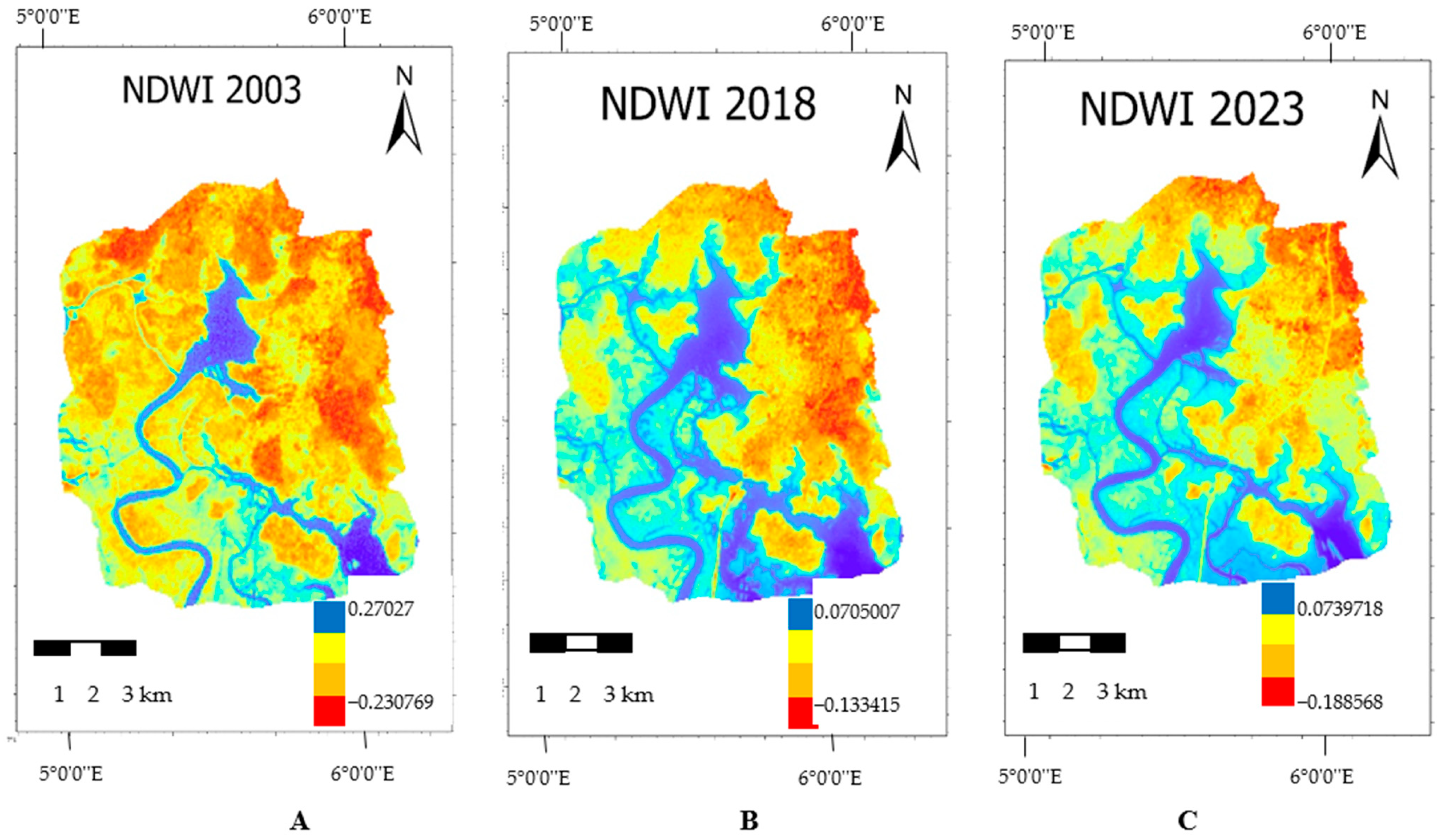 | NDWI | Landsat 7 | (Green − NIR)/(Green + NIR) | (B2 − B4)/(B2 + B4) |