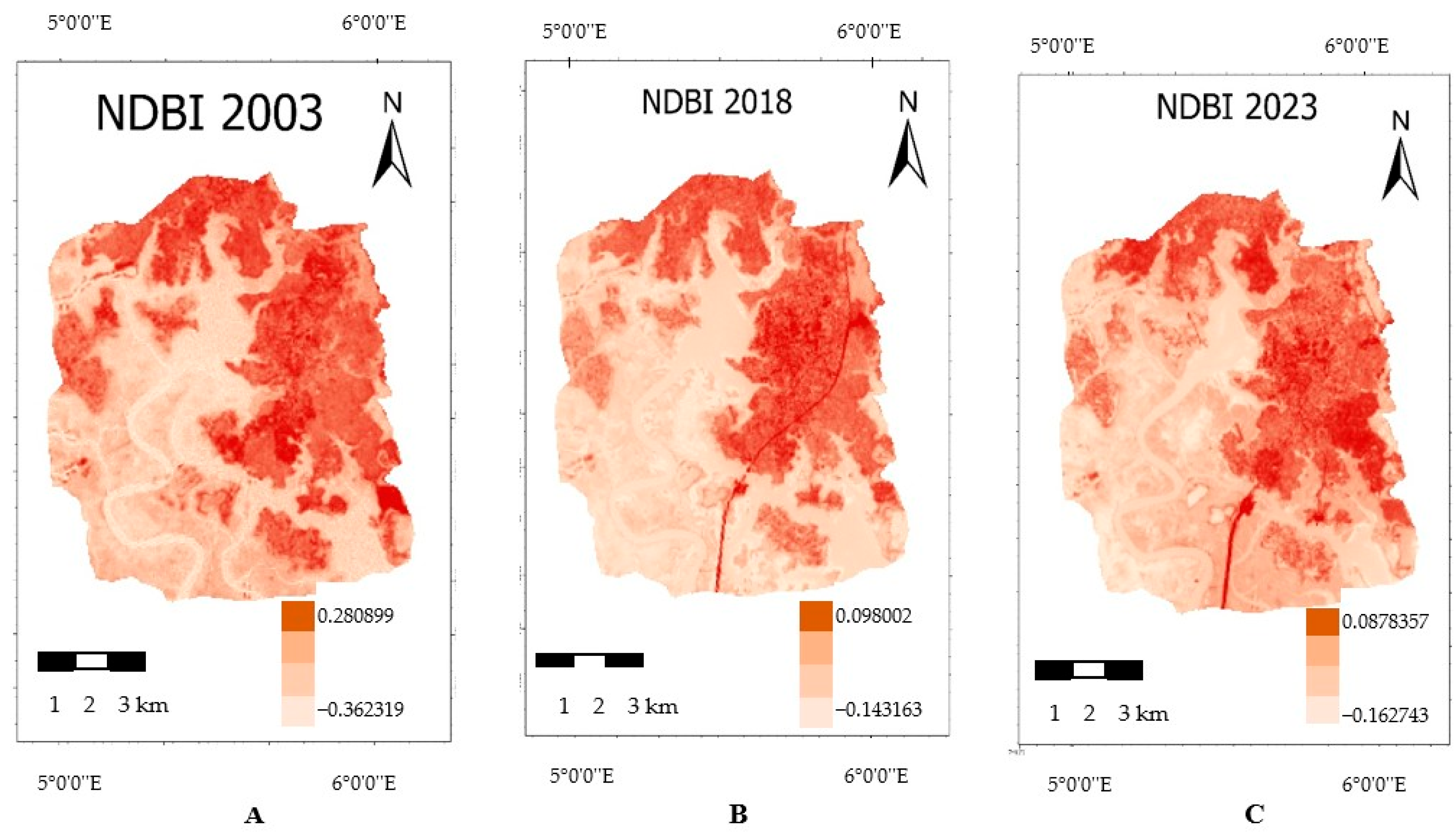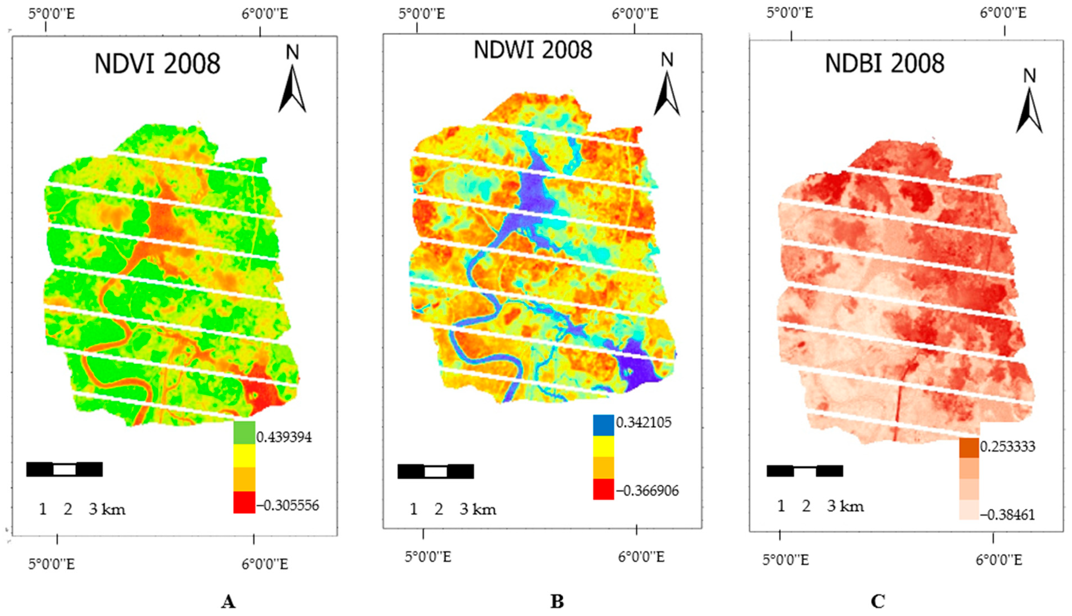 | Landsat 8 | (SWIR − NIR)/(SWIR + NIR) | (B6 − B5)/(B6 + B5) |