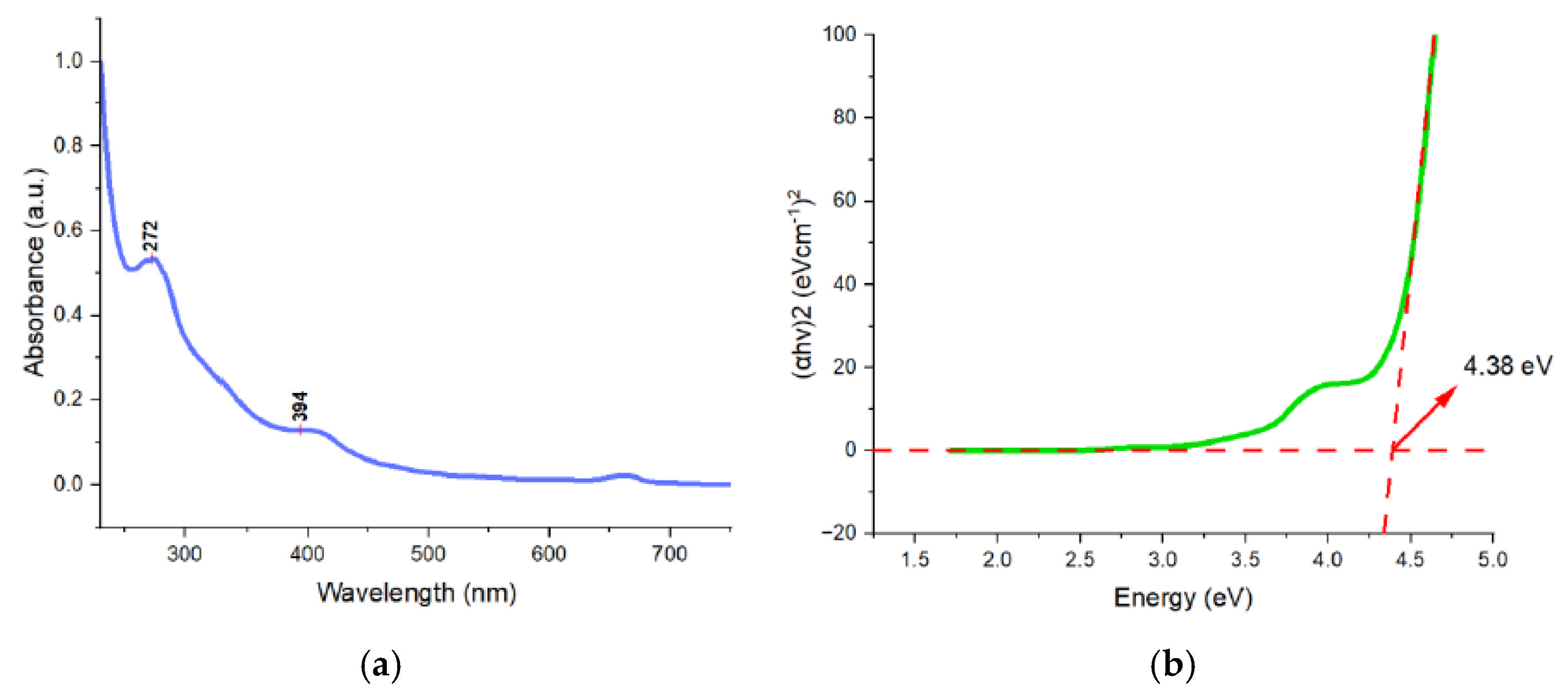 The band gap energy of the optimized N-doped water hyacinth CDs was calculated to be 4.38 eV using the Tauc plot method based on a linear fit, as illustrated in