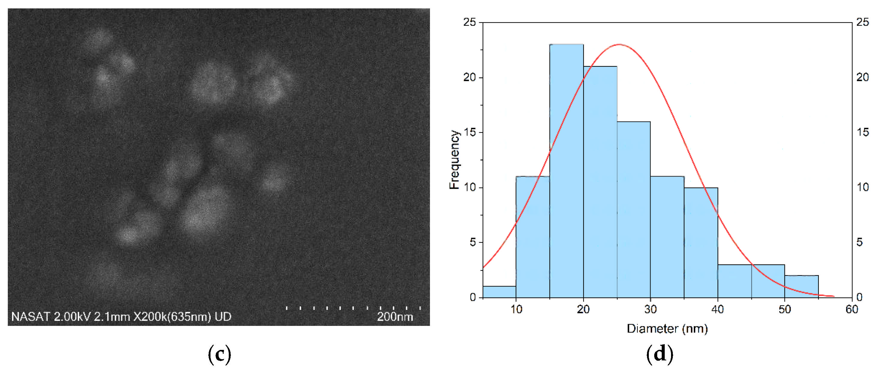 Figure 4d, which indicates a size range between approximately 8 and 55 nm, with the majority of the 15 and 30 nm reflecting a broad and slightly right-skewed distribution, suggesting non-uniform particle formation.