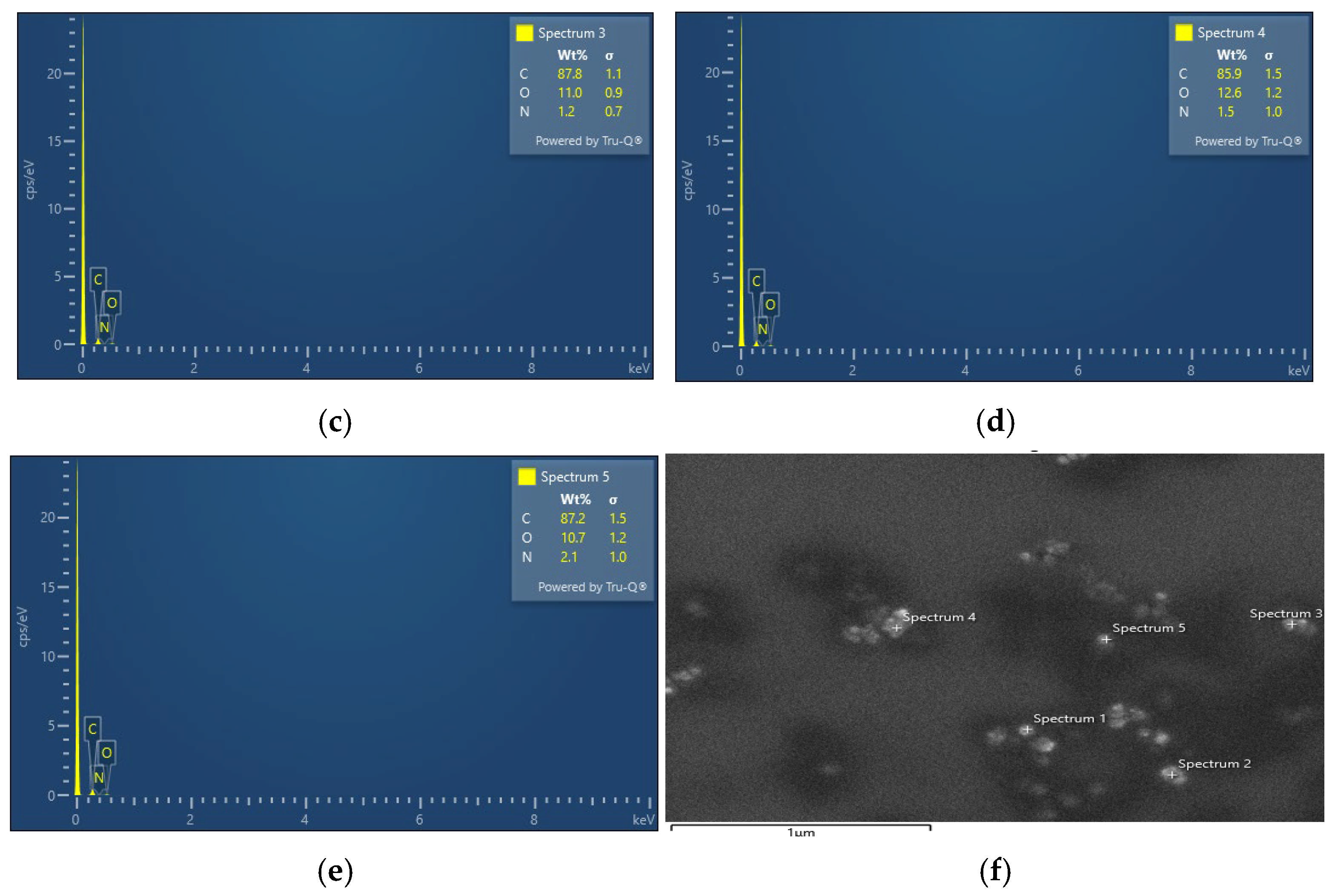 Figure 5b, nitrogen was not detected, likely due to its low-energy peak being obscured by the nearby and stronger oxygen peak, as oxygen is more abundant, or by background noise. This can lead to signal overlap and misidentification [