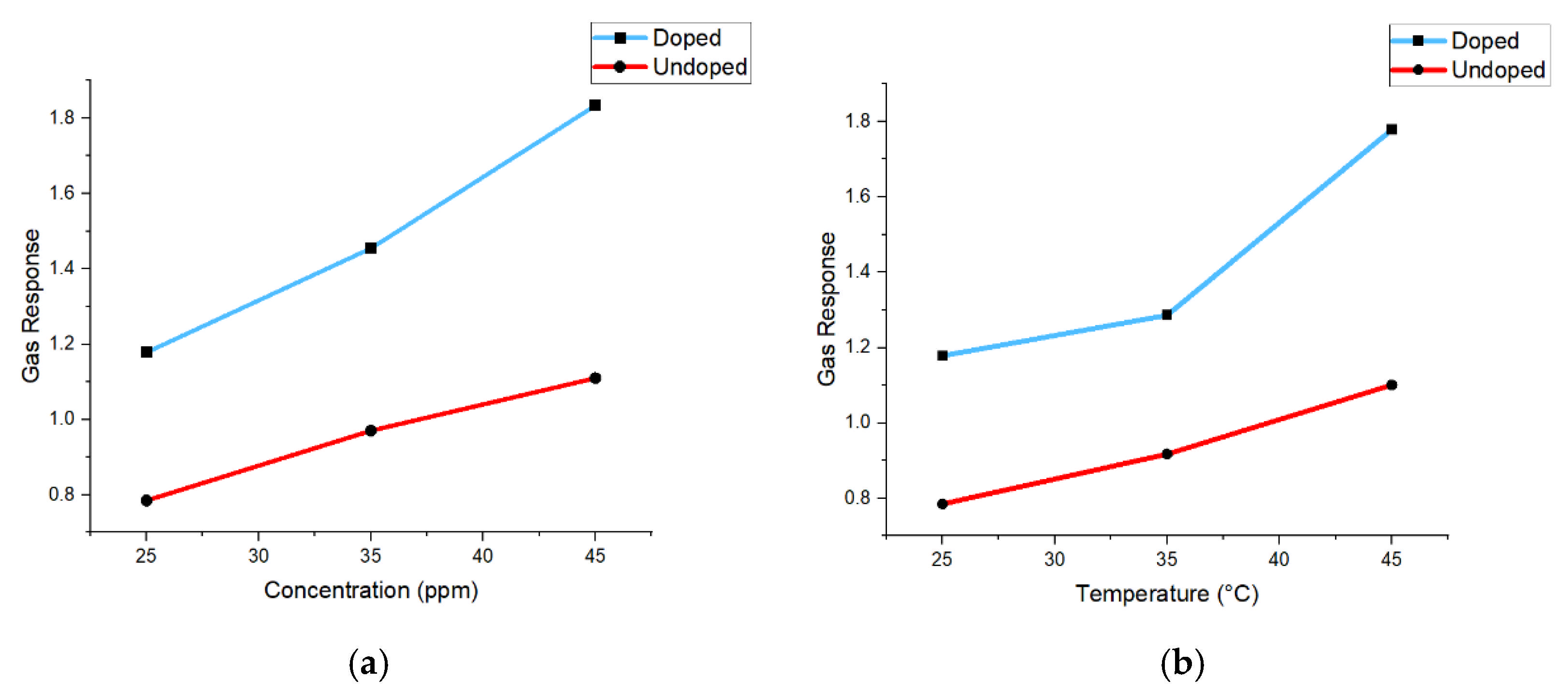 The gas response of the prepared sensors with doped and undoped samples was evaluated at different temperatures (25, 35, and 45 °C) and gas concentrations (25, 35, and 45 ppm CO) using the following equation: