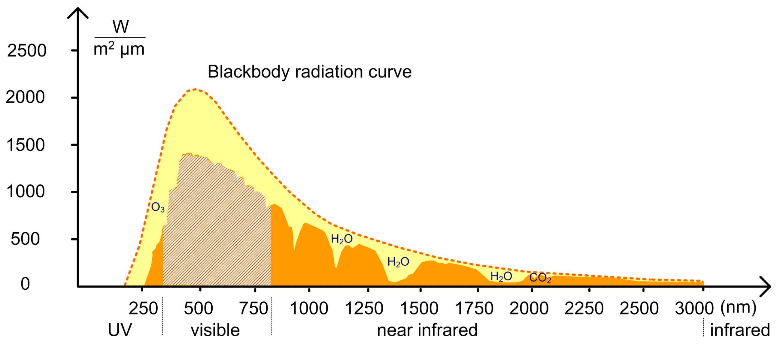 Figure 1 shows the distributions of solar energy, with the peak in the visible range corresponding to the main portion of incoming radiation that warms the Earth’s surface. The longer wavelengths represent infrared radiation, which is partially absorbed and re-emitted by atmospheric gasses. Some of this radiation is radiated back into the atmosphere as infrared energy, where it is partially absorbed by carbon dioxide and water vapor molecules, while the rest is radiated back to the Earth’s surface and contributes to further warming. These energy transitions are summarized as the greenhouse effect [