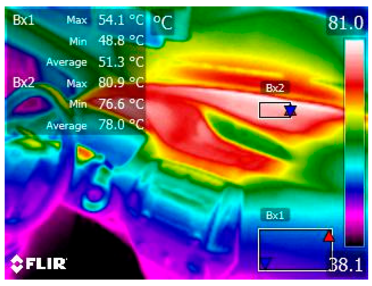 Figure 2 is a thermogram of the car’s control panel taken with a FLIR thermal imaging camera, model E6. The thermogram shows that the maximum temperature near the control panel is 81 °C. As the electromagnetic waves peak in the visible part of the spectrum, the car windows could be fully protected with inserts that have minimal absorption, essentially white bodies, the opposite of black bodies.