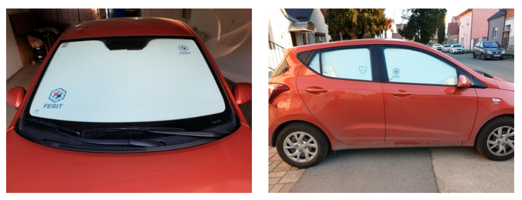 13]. The measurements were carried out on 9th and 10th of May 2022 under very similar weather conditions (26 °C, sunny, cloudless) in a vehicle parked at the Faculty of Electrical Engineering, Computer Science and Information Technology Osijek, in Osijek. On 9 May, the measurements were carried out without window inserts, and with inserts on 10 May. In both cases, the car was parked in direct sunlight for two hours before the measurement, specifically from 13:00 to 15:00 pm. The air temperatures at three points in the interior were recorded using digital probes, with the readings extracted from the smartphone video footage in 2 min intervals. The car remained closed the entire time.