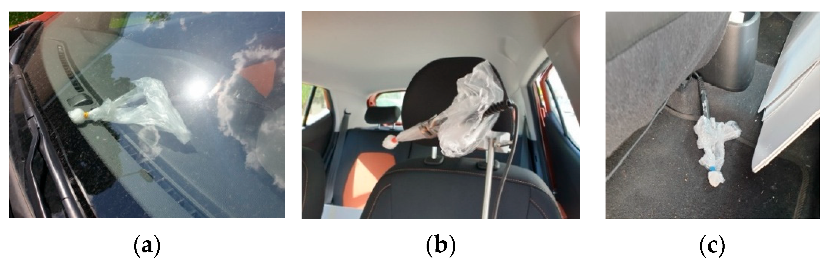 Figure 4 shows the probe setup. The measurements were carried out in the interior of a Hyundai i10, model year 2014, with an interior volume of 252 L [
