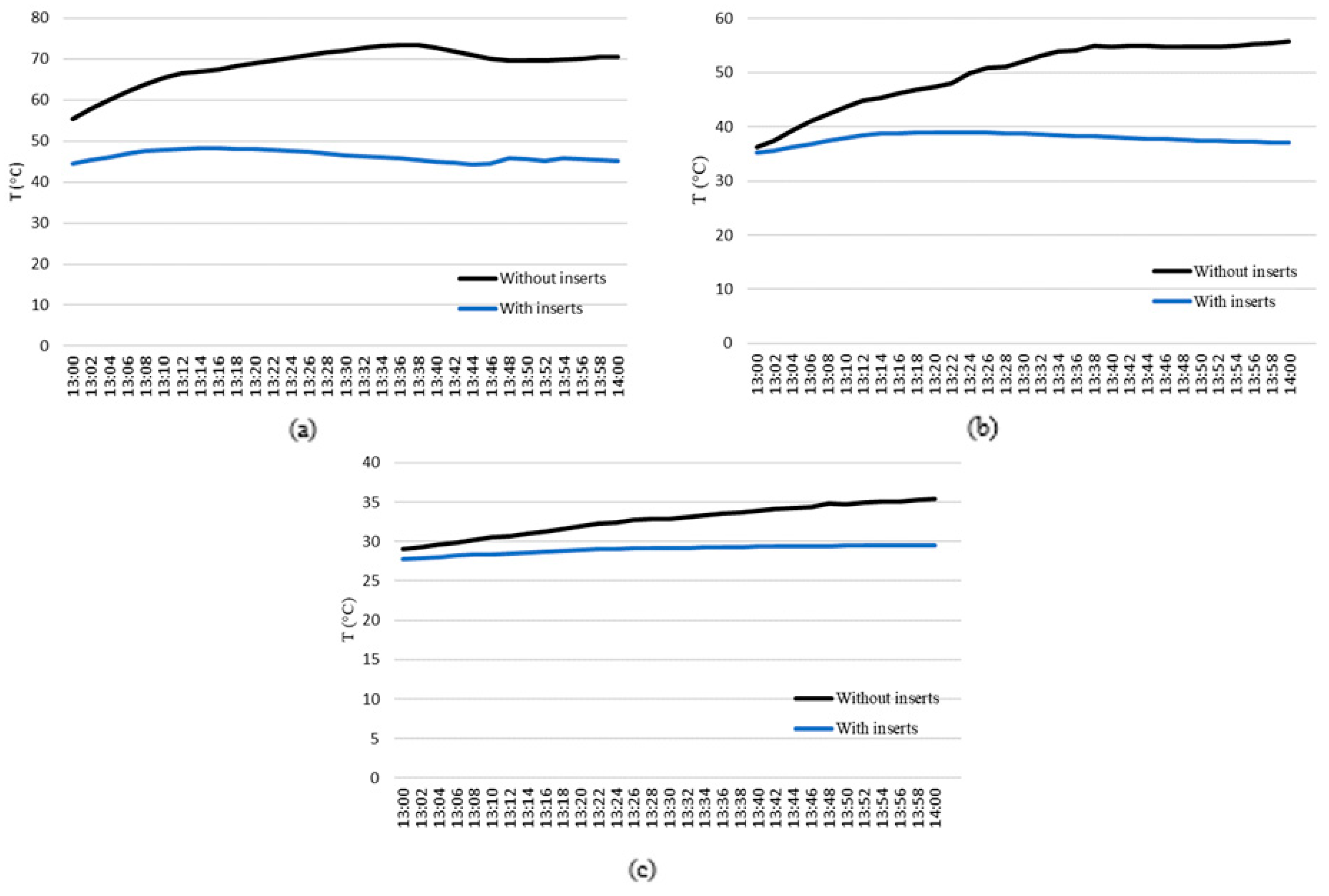 The highest temperatures were recorded at the windshield, while the lowest were rescored near the floor. Specifically, the temperature at the windshield (point A) reached maximum of 70.6 °C without inserts, and 45.1 °C with inserts. Near the driver’s head (point B), the temperature reached maximum of 55.4 °C without inserts, and 37.1 °C with inserts. At point C, the temperature reached maximum of 35.4 °C without inserts, and 29.5 °C with inserts.