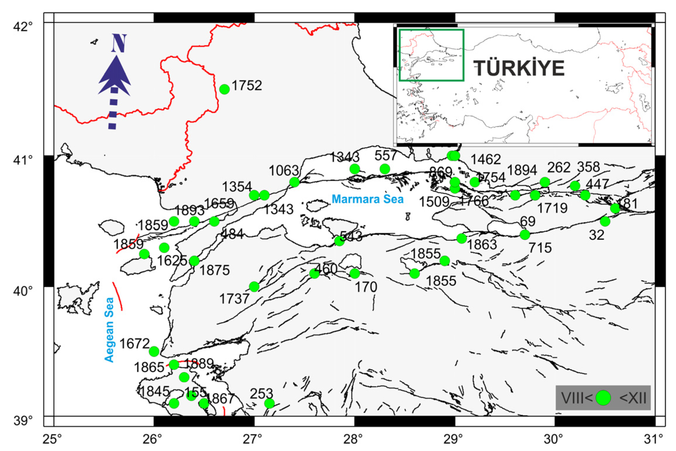 15]. These five earthquakes occurred on these faults, and their locations are consistent with the extent of the faults. Earthquake number 11 occurred on the Karabiga fault, a right-lateral strike–slip fault extending approximately 15–20 km.