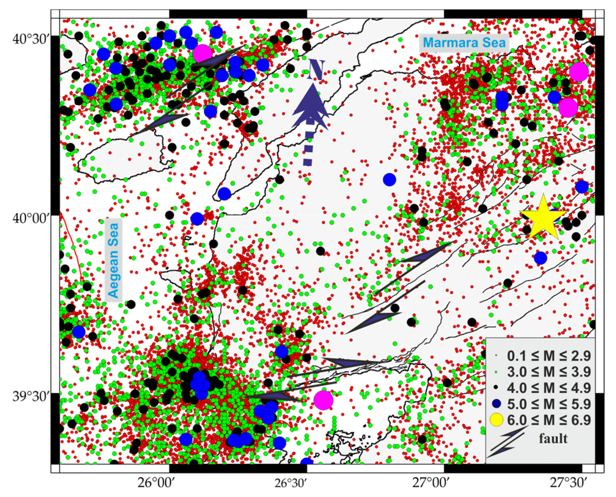 Earthquake number 13 is located on the right-lateral strike–slip Sarıköy–Inova fault, which has a NE–SW strike–slip motion. Earthquake number 12 occurred on the Yenice–Gönen Fault, which is a right-lateral strike–slip fault with a NE–SW strike in the western segment. Earthquake numbers 10, 15, and 19 occurred on normal faults that trend NW–SE and north, bound for the northern part of Lesvos Island. On the other hand, earthquakes 16 and 18 occurred in almost the same region and are faults that intersect the Mytilene Fault at right angles. These are local earthquakes. Earthquake No. 14 is located at the eastern end of the Edremit fault, a south-trending normal fault running in an approximately north–south direction. Earthquake number 7 is located west of the Balıkesir–Havran fault system at the southernmost tip of the Biga Peninsula. It is a normal fault that is distant from active tectonic elements and consistent with the main regional extension direction. Earthquakes No. 4 and No. 5 are located on two right-lateral strike–slip secondary faults that are consistent with the North Anatolian Fault, which bounds the northern part of the Gallipoli Peninsula and extends into the Saros Gulf. Earthquake number 8 is located at the southwest end of the Pazarköy–Hamdibey–Kalkım strike–slip normal fault, which trends approximately northeast–southwest and has a right-lateral strike–slip component. Earthquake number 20 is a south-trending, strike–slip, normal fault with a prominent right-lateral, strike–slip component. It is located just north of the Edremit fault and is consistent with it. Earthquake 17 is located southeast of Bozcaada. Another strike–slip fault compatible with the extension and characteristics of these faults is located just south of the Troia Fault System [