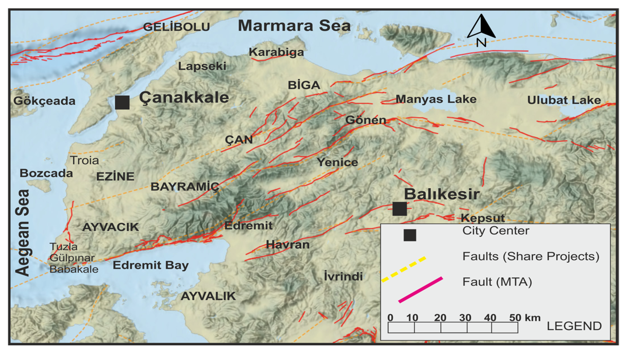 4], the active faults within the Biga Peninsula have been thoroughly delineated. In this area, the faults forming the regional stress regimes are predominantly laterally thrust faults with a normal component. The area under consideration is characterized by the presence of numerous NE–SW strike–slip faults that are oriented parallel to each other. In the Biga Peninsula, the southern tributary reaches the Aegean Sea via Gönen, Yenice, and Edremit Bay, whereas the central tributary passes through Sarikoy, Can, Bayramic, and Ezine. The 1953 Yenice–Gönen earthquake (M = 7.4, KOERI) resulted in a 3.5 m right-lateral movement along the southern branch and an NE–SW-trending lateral strike–slip rupture zone. The Yenice–Gönen earthquake on 3 March 1969 (M = 5.8, KOERI) exhibited a predominant thrust component, suggesting that the Biga Peninsula experienced uplift through this mechanism [