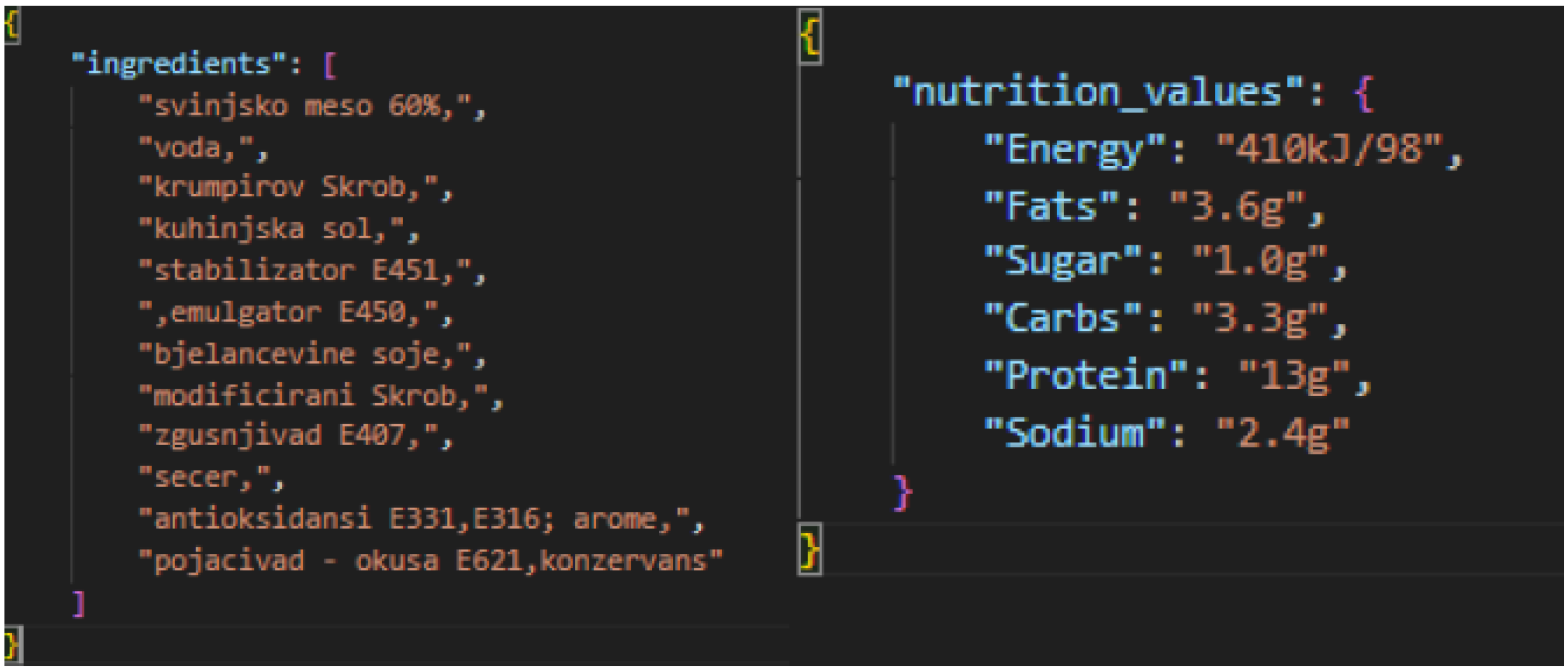 By photographing this product, JSON documents are automatically generated on the server side, containing the values that the docTR model successfully extracted from the images. These values are the result of optical character recognition (OCR) applied to both the list of ingredients and the nutritional information table.