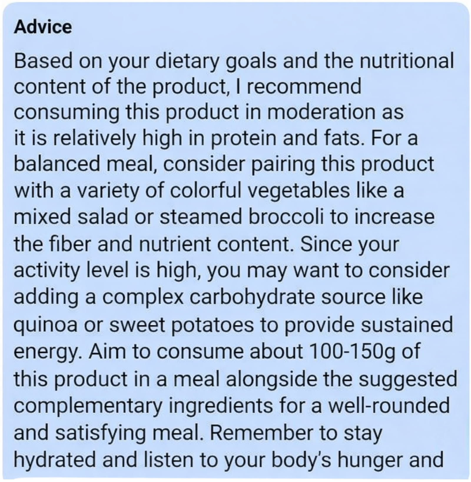 This advice is tailored to the user’s dietary profile and preferences, combining product-specific nutritional data with user-specific health goals or restrictions, thereby demonstrating the practical application of intelligent recommendation systems.