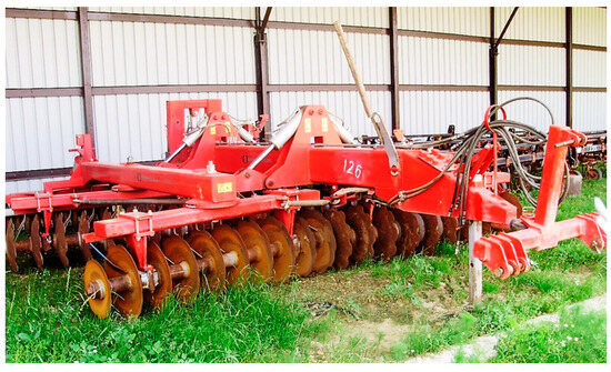 A disc harrow is a tool for supplementary soil cultivation. The disc harrow is used to break up the soil after primary tillage and to incorporate and mix mineral fertilizers, manure, chopped plant residues, etc., into the soil. Figure 2 shows Kongskilde’s Terra-X-700 heavy-duty trailed disc harrow (Manufacturer: Kongskilde Industries A/S, Sorø, Denmark), which is equipped with 56 discs.