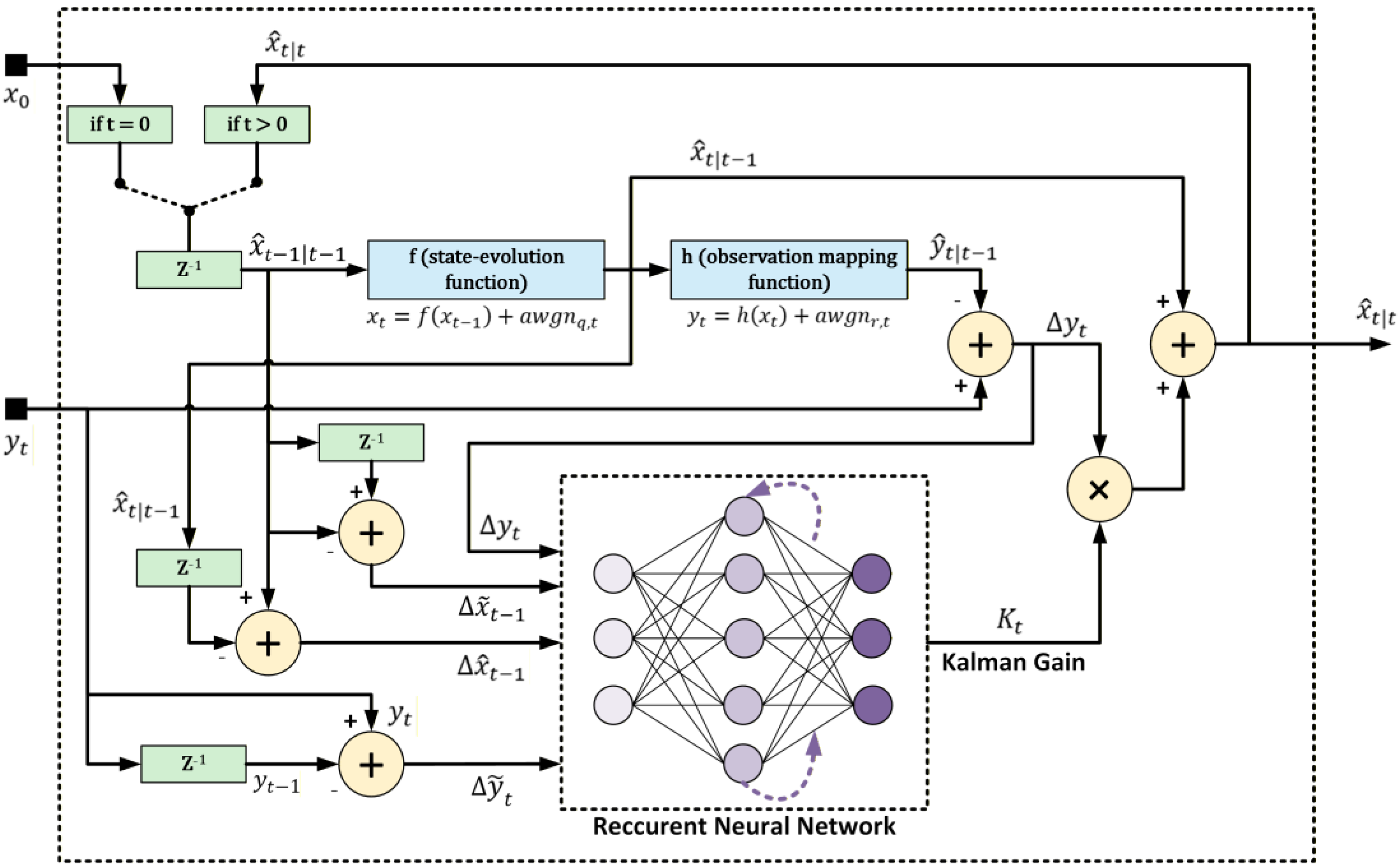 - Revach, G.; Shlezinger, N.; Ni, X.; Escoriza, A.L.; Van Sloun, R.J.; Eldar, Y.C. KalmanNet: Neural Network Aided Kalman Filtering for Partially Known Dynamics. IEEE Trans. Signal Process. 2022, 70, 1532–1547. [Google Scholar] [CrossRef]