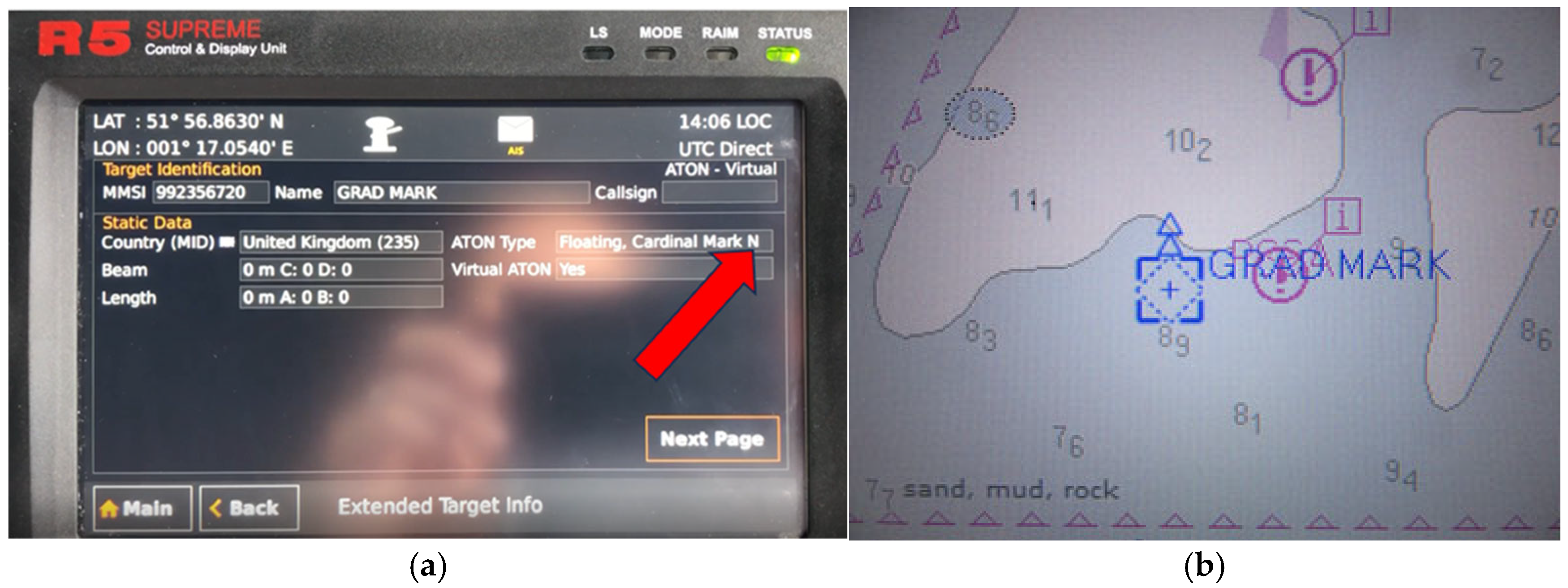 Figure 4. Photographs showing the virtual north cardinal mark correctly received aboard THV Alert by (a) the ship’s AIS transceiver, and (b) the ship’s ECDIS. (Note that the coordinates shown on the AIS transceiver in this photograph are the moored position of THV Alert, not the VAtoN position).
