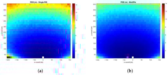 Coverage analysis for different user positions using PEB: (a) single-RIS configuration with RIS placed at (white square), and (b) multi-RIS configuration with RISs placed at (white square) and (pink square).